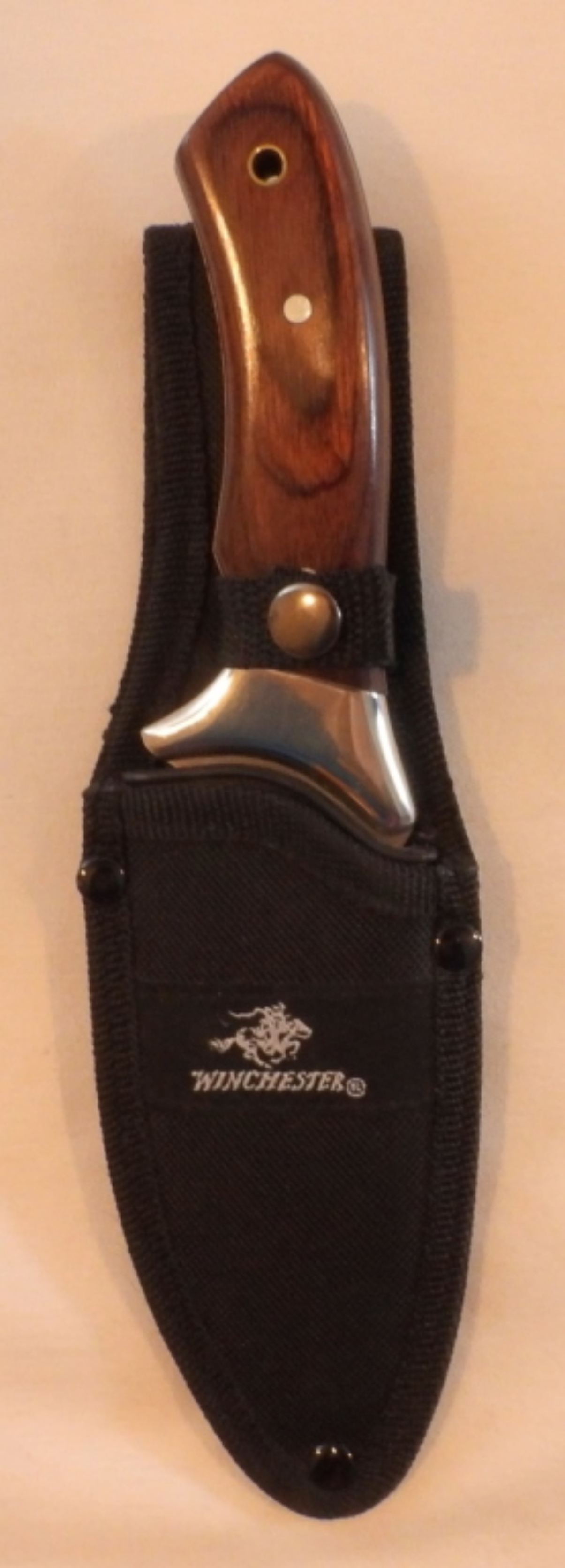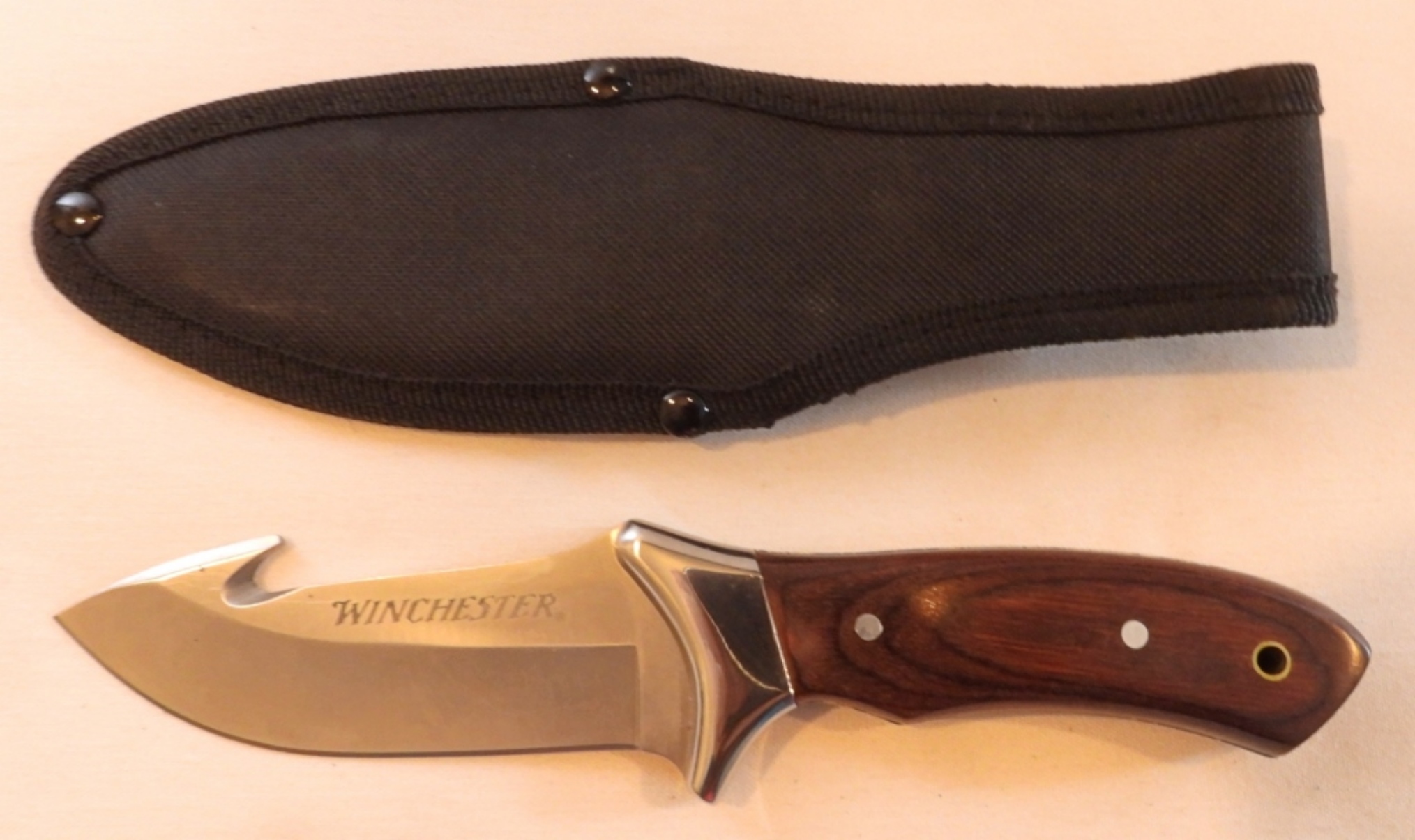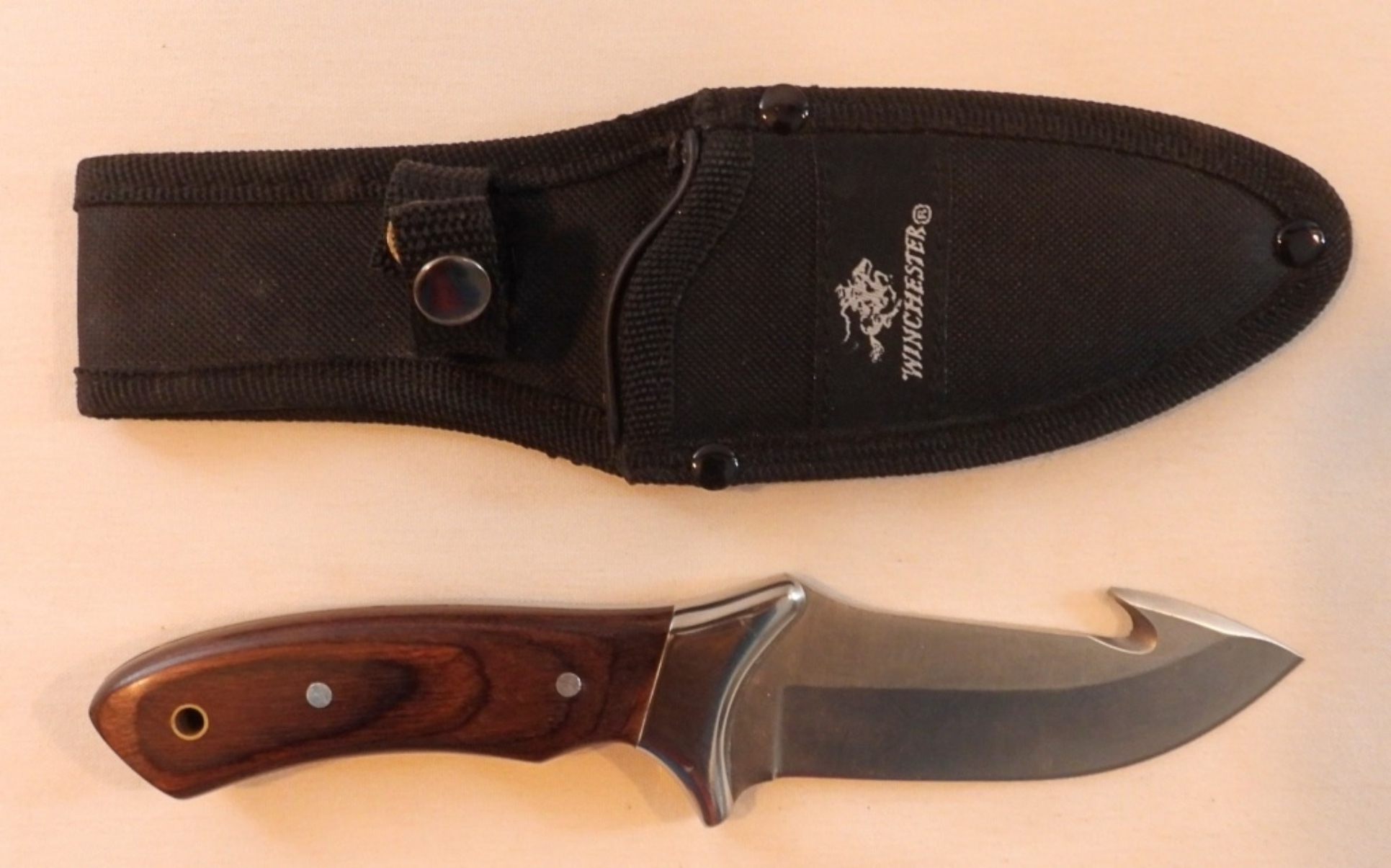 Winchester hunting knife with a drop point blade and a gut hook, total length of 9″, black sheath with working snap, good shape
