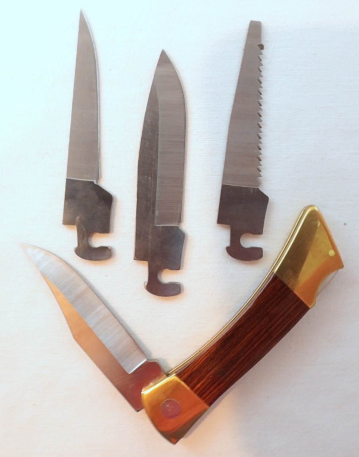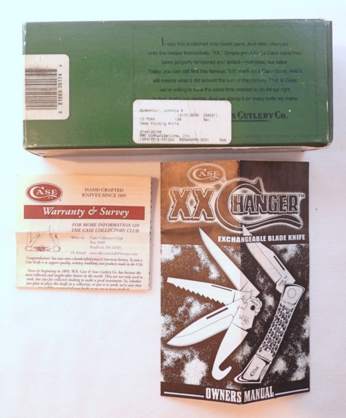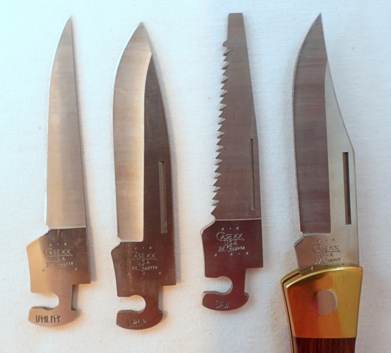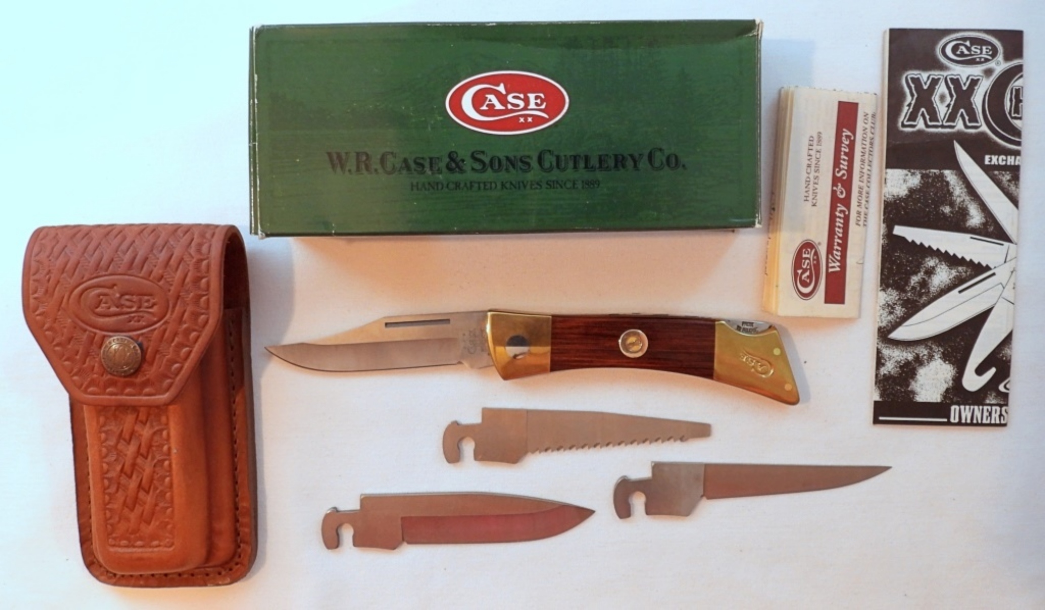 Case XX changeable blade knife with 4 blades total, lengths about 3 1/2″, handle length 4 3/4″, comes in leather sheath with original box and users manual