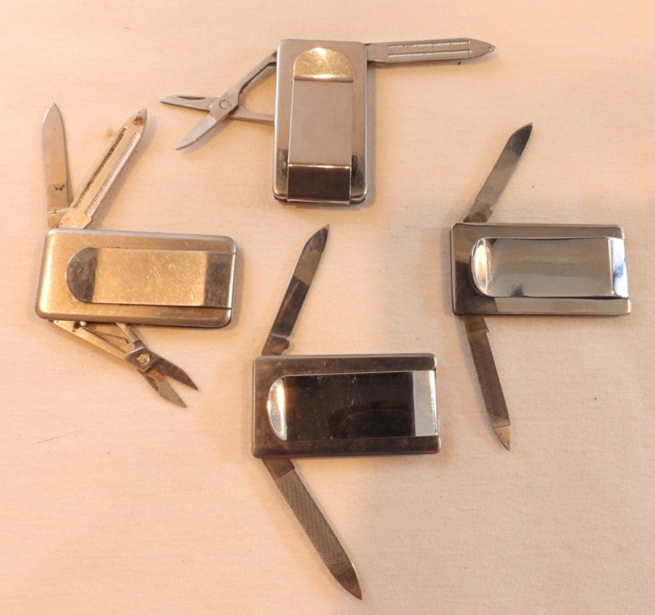 4 2″ long money clip/knives, a couple of businesses, a Winchester and a Bible quote