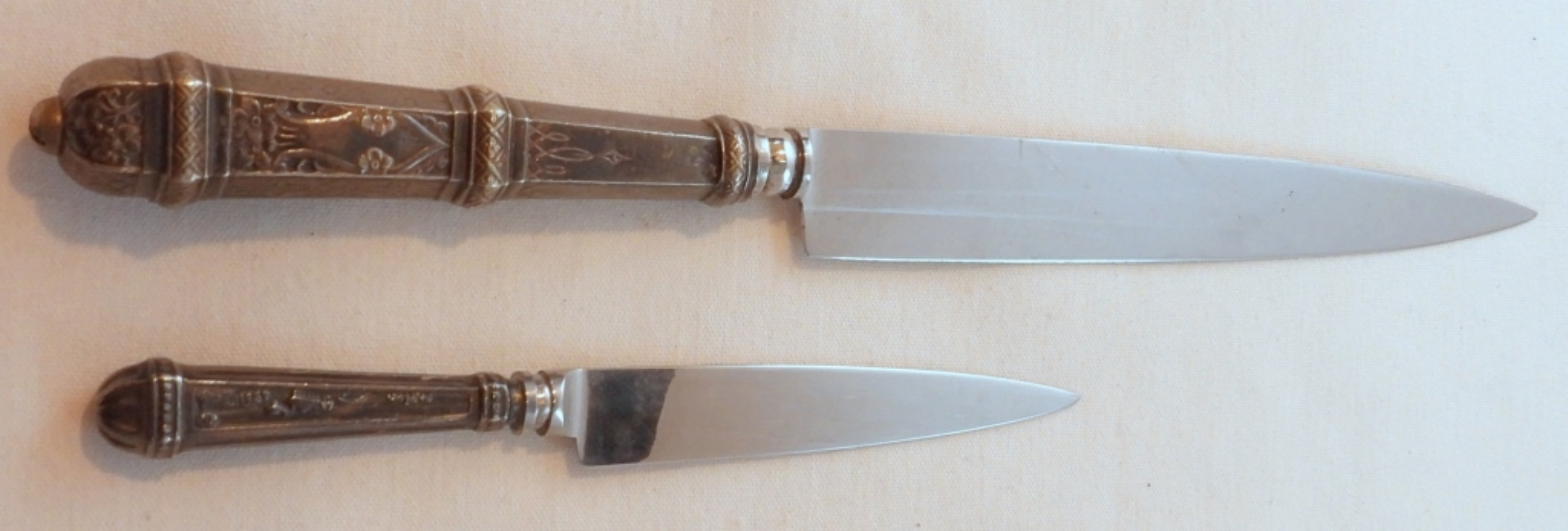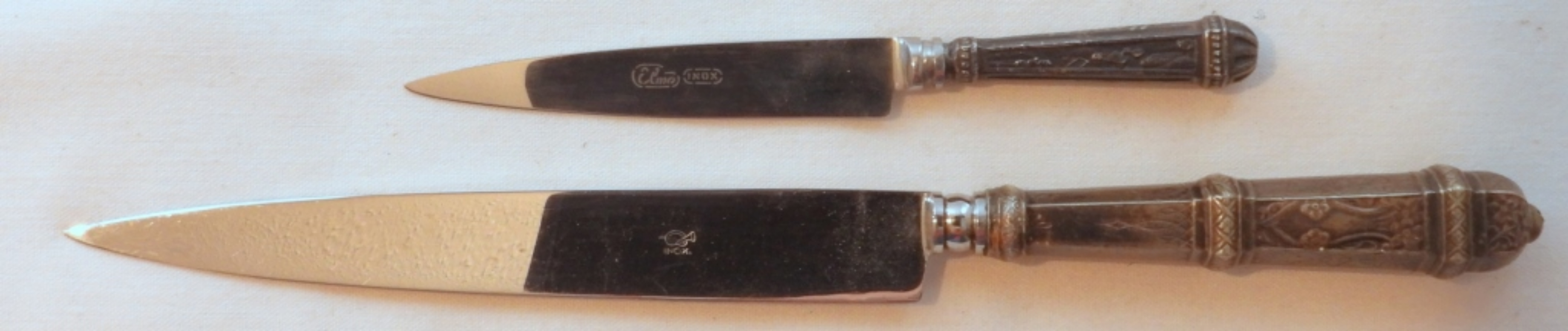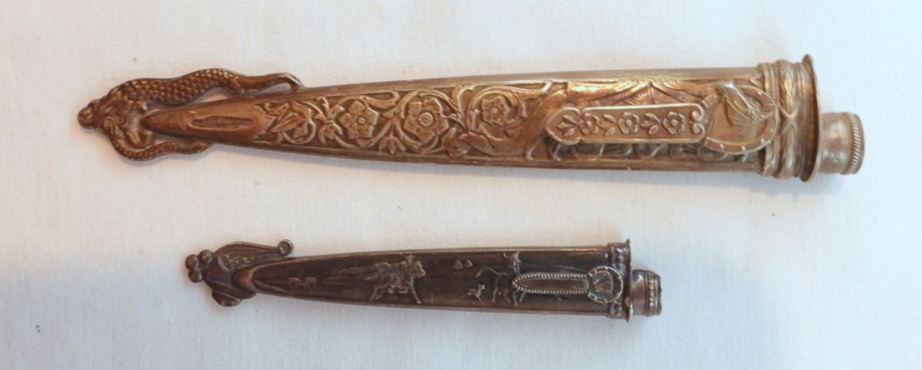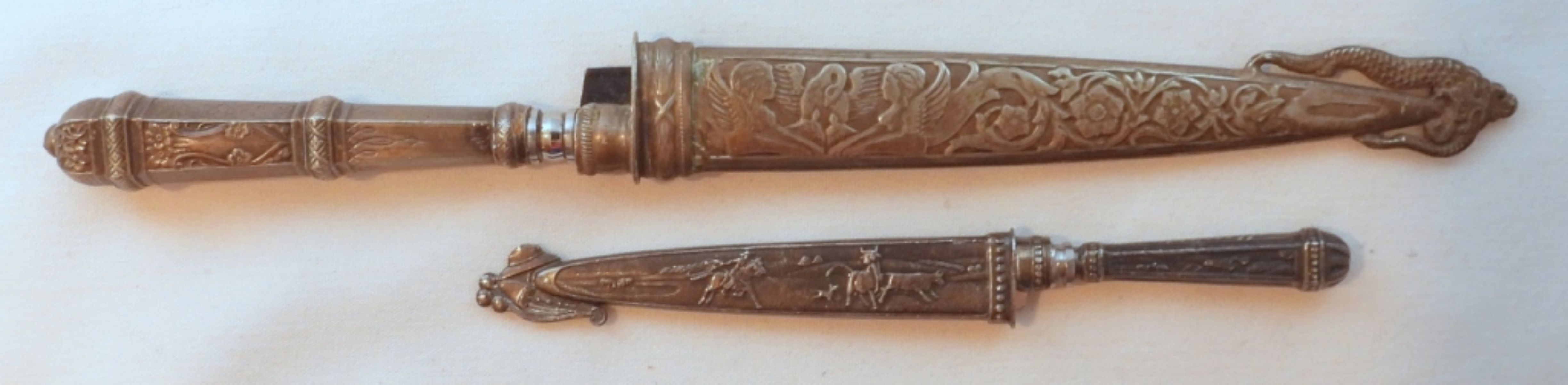 Eberle Gaucho knives with ornate scabbard, letter openers, 6″ blade, total length 10 1/4″, and 3 1/2″ blade with a length of 6″