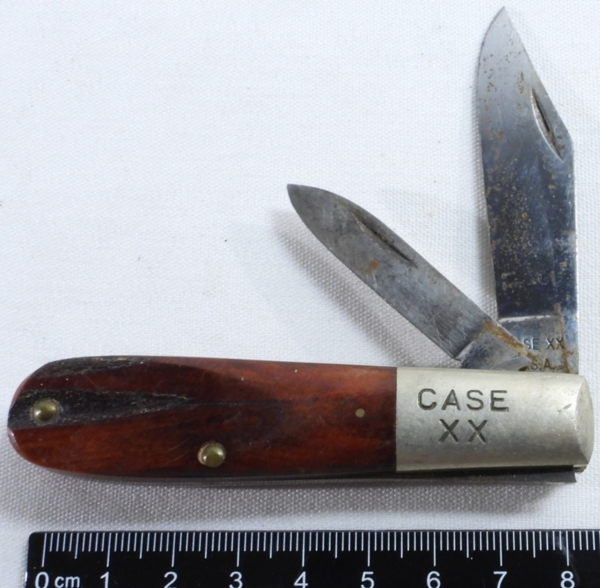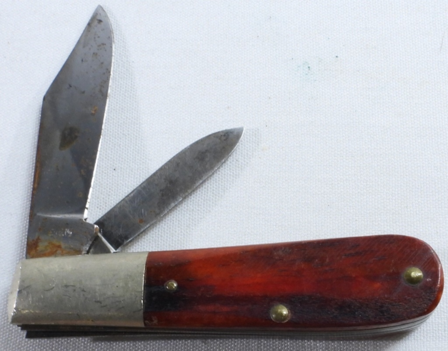 This has a cherry colored wood handle. The blades do have some rust