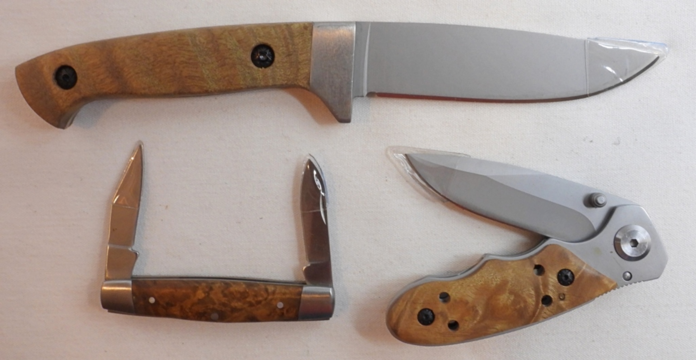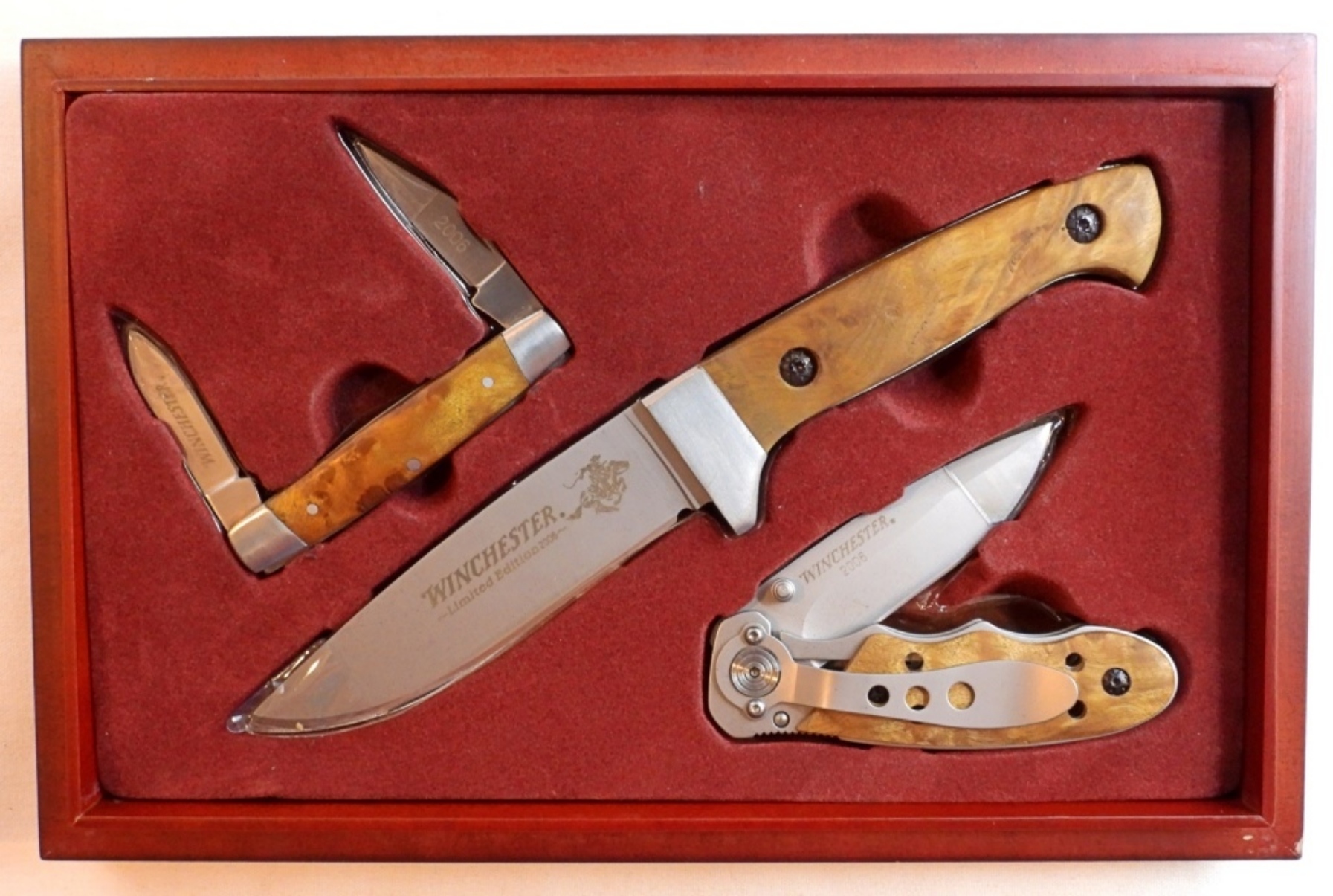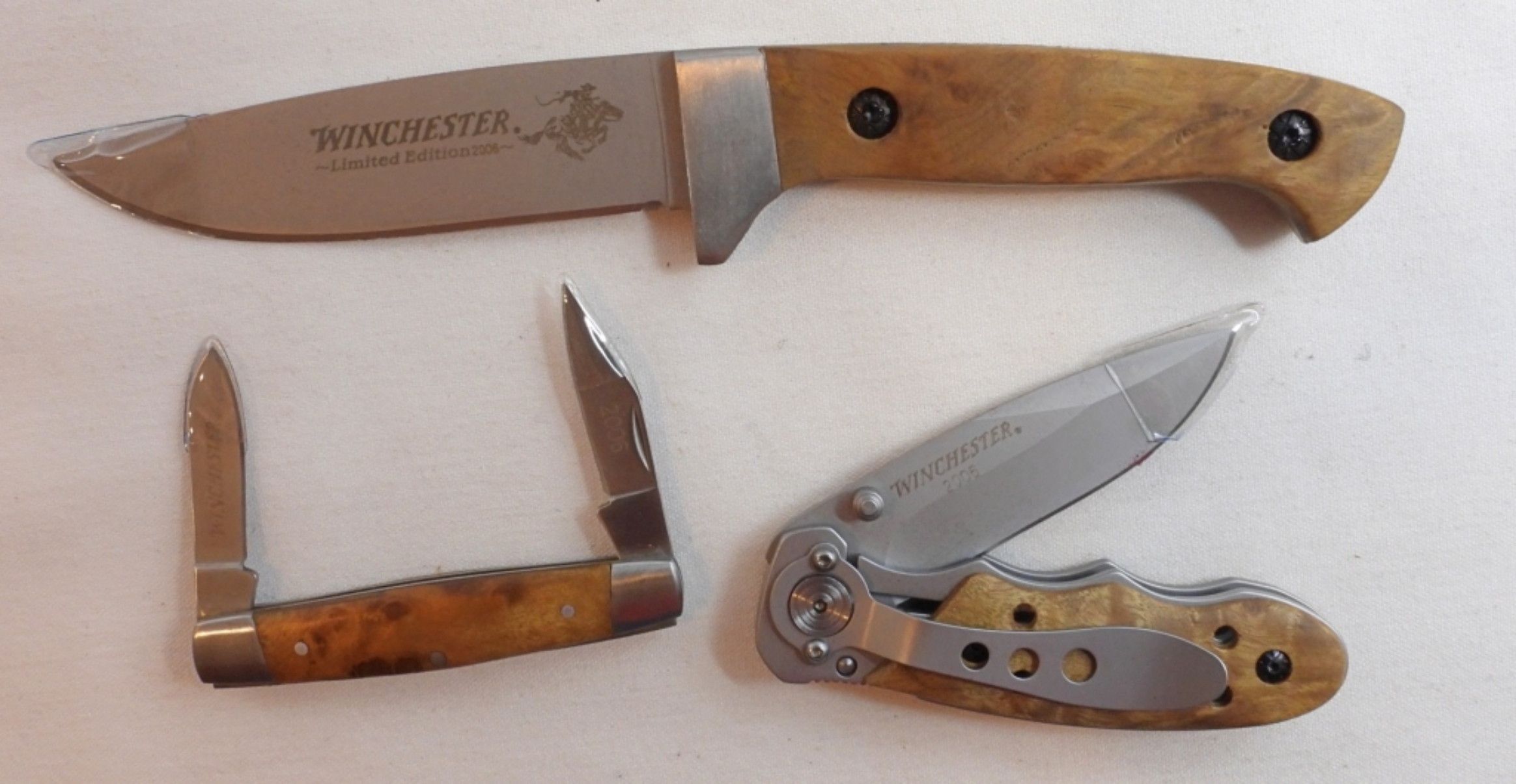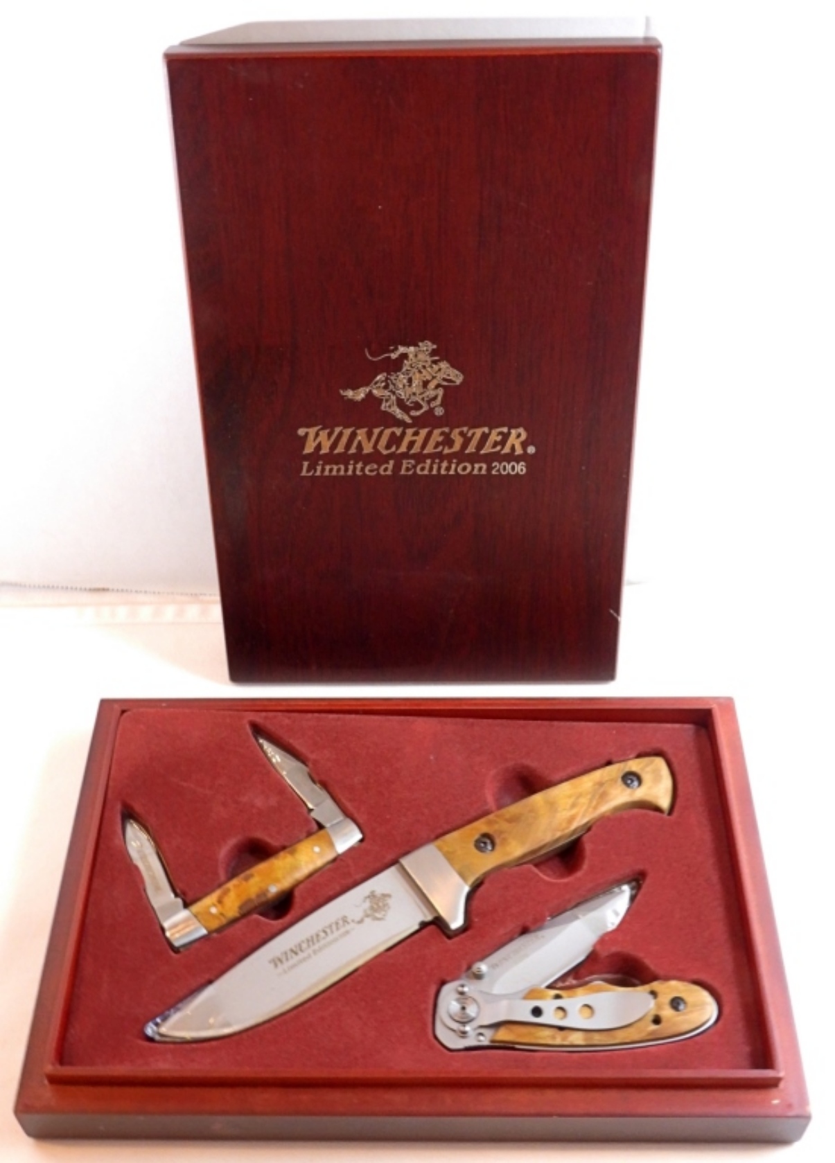 2006 Winchester limited edition set of 3 knives, 1 fixed blade with a 4″ blade, dual blade pocket knife short blades, and a 3″ blade pocketknife