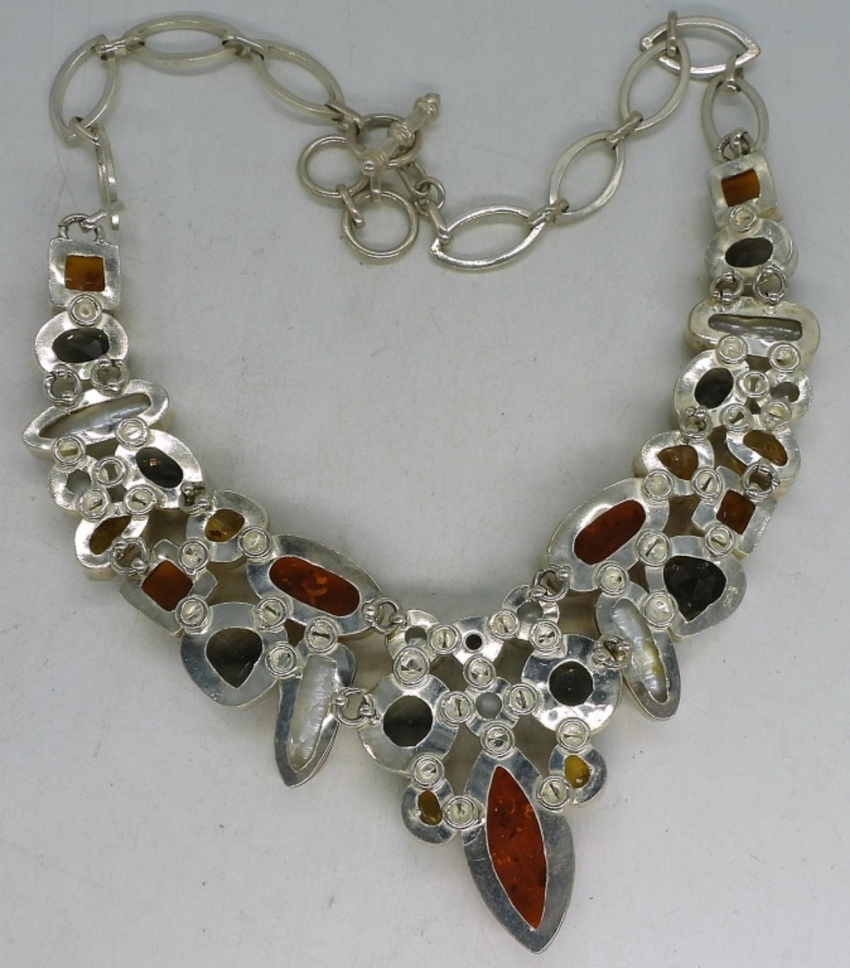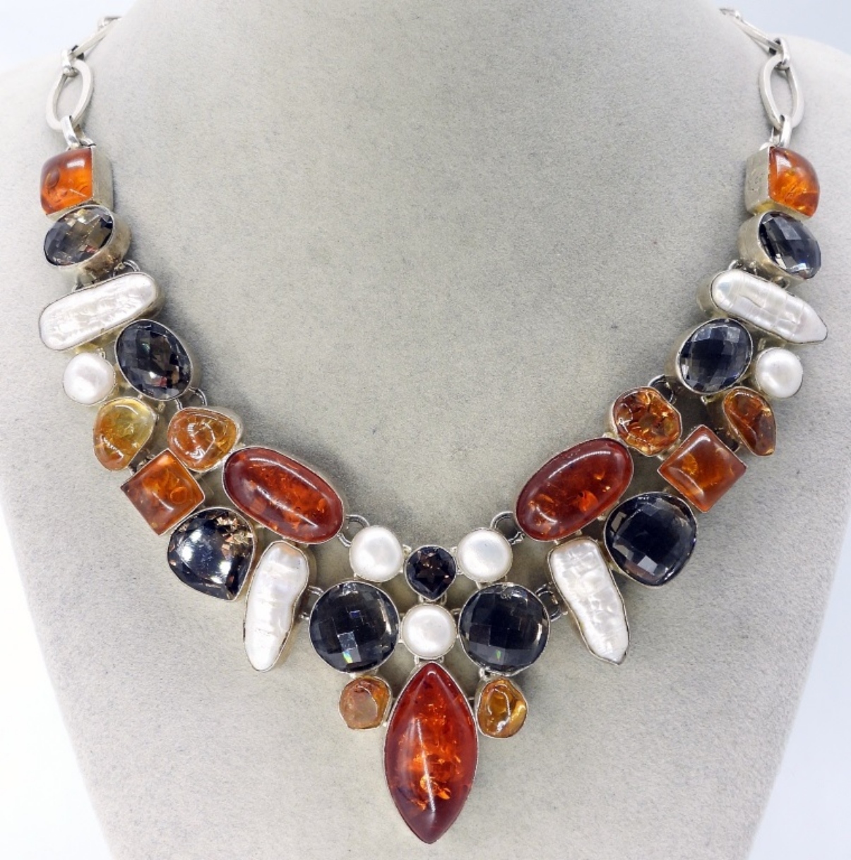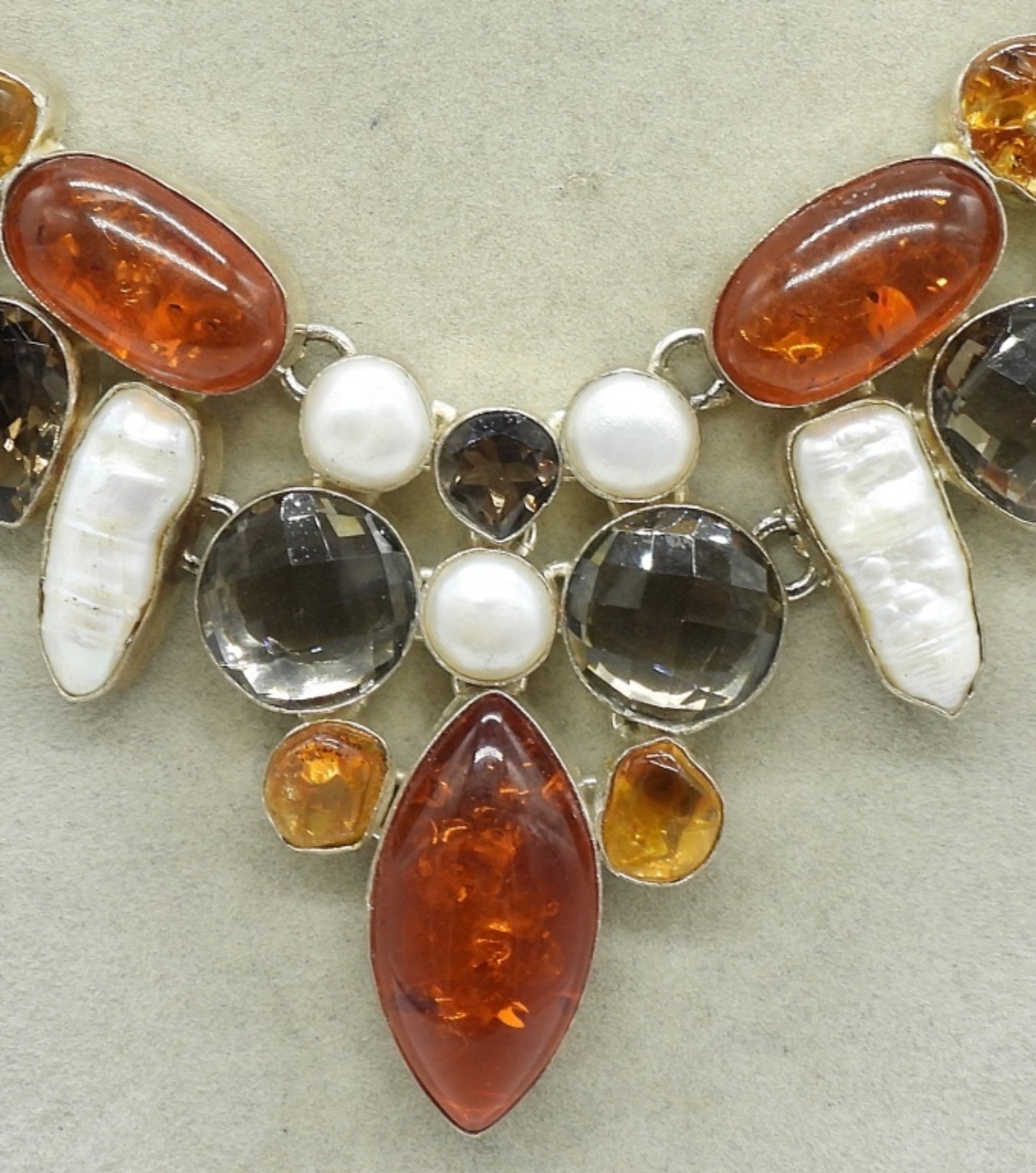 Gorgeous collar style, sterling. Amber, Pearl & Smokey Quartz Gemstones. 20″. (40 dwt)