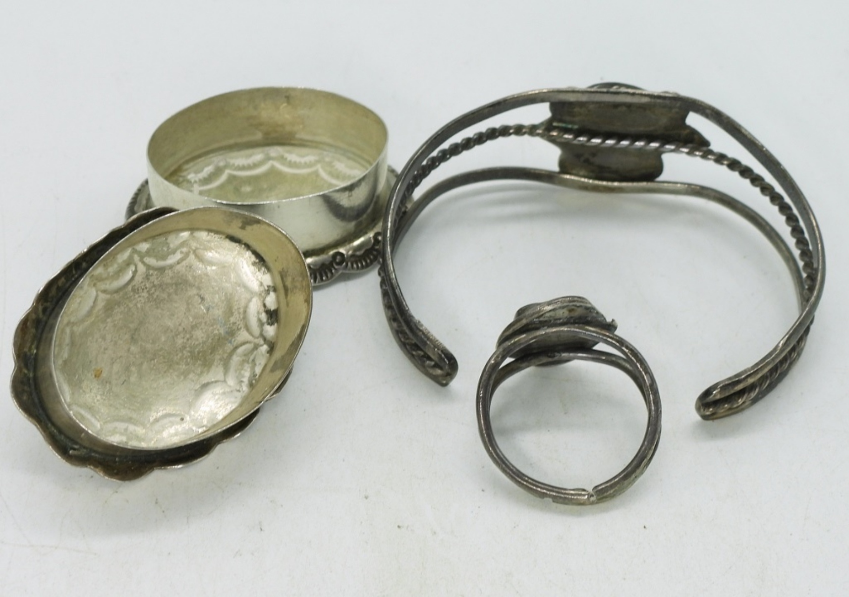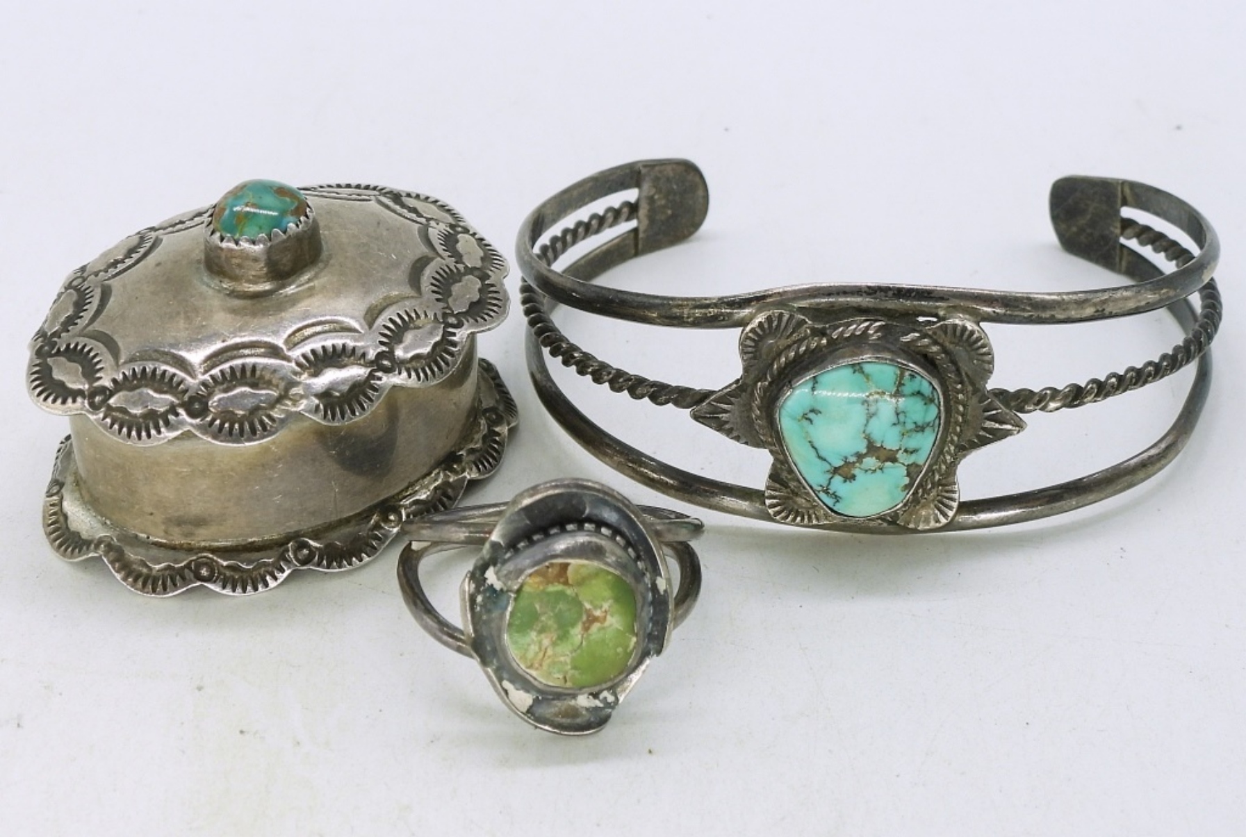 Sterling Turquoise cuff bracelet, 7″. Ring size 8. Trinket box with turquoise top, 1.5″ x1″. (23.9 dwt)