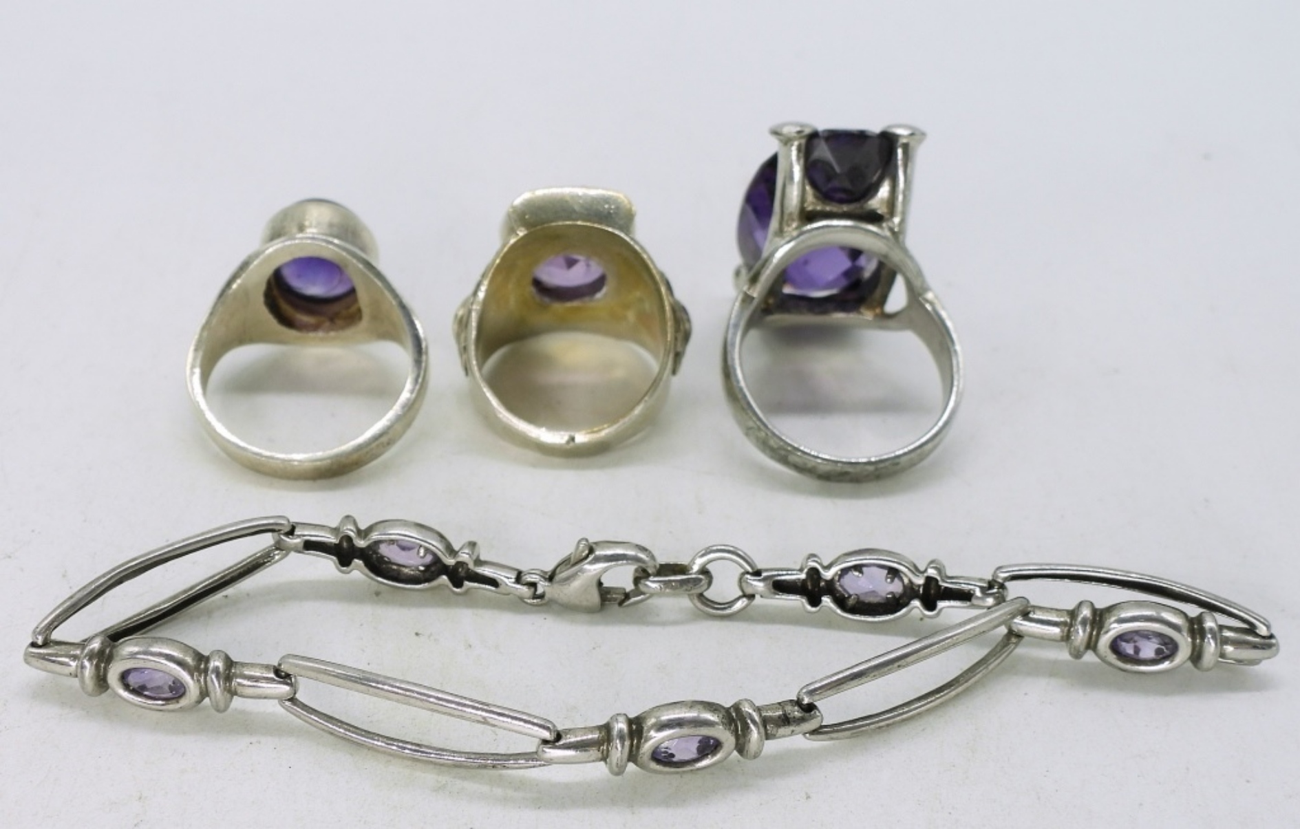 Three sterling rings with amethyst gemstones. Sizes 4.5 & 7.5. Sterling amethyst bracelet, 7.5″. (26.3 dwt)