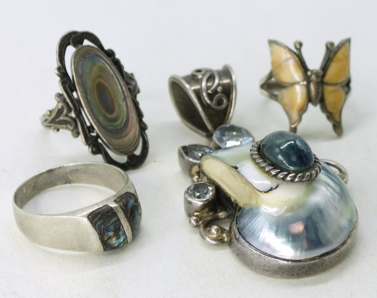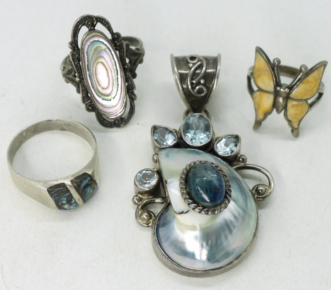 3 sterling rings, abalone & unknown. Sizes 6, 9, 9.5. Sterling shell pendant with labradorite and blue topaz gemstones. 2.5″ long. (19 dwt)