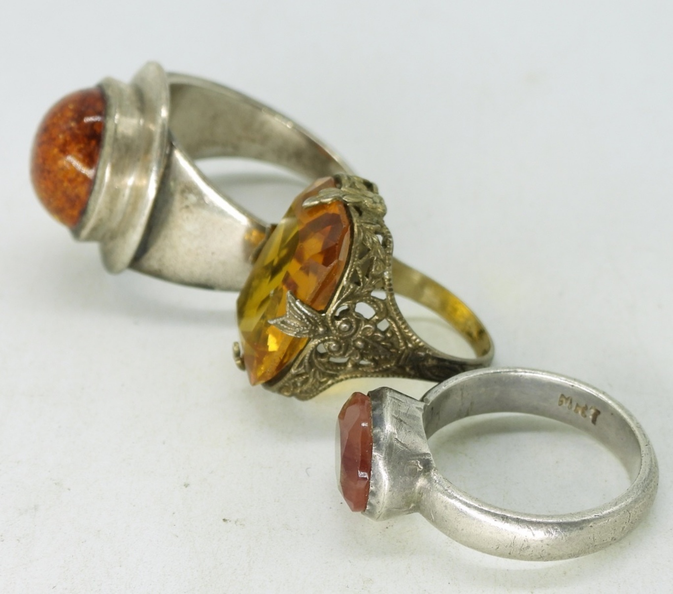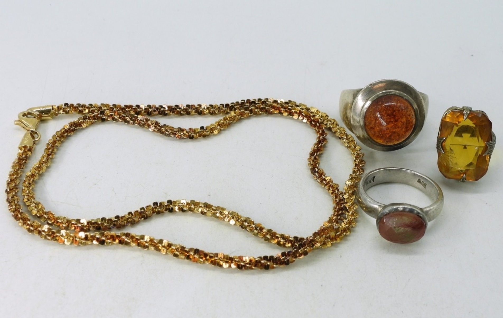 Gold Tone Sterling Chain, 20″. Three sterling rings, Amber, Citrine and Watermelon Tourmaline. Ring sizes 3.5, 8, 12 (23.8 dwt)