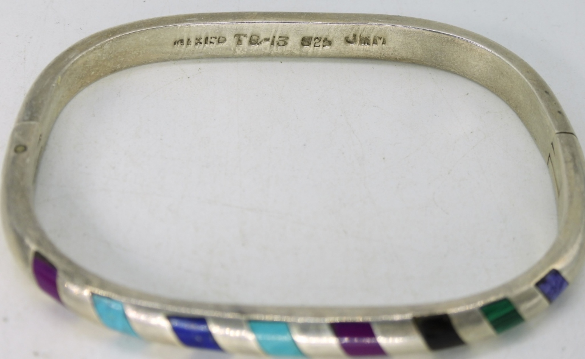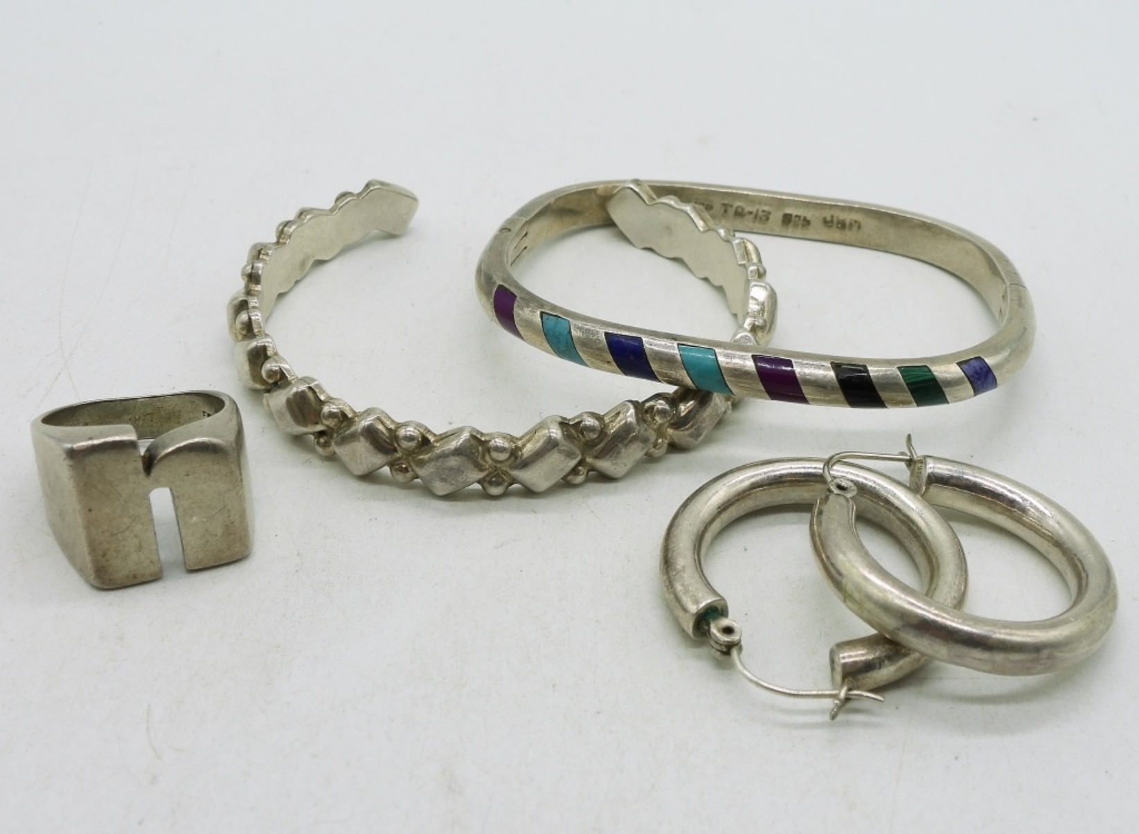 Two sterling Taxco bracelets. “TB-166” & “TO-13”. Ring size 8. Sterling pierced hoop earrings. (46.9 dwt)