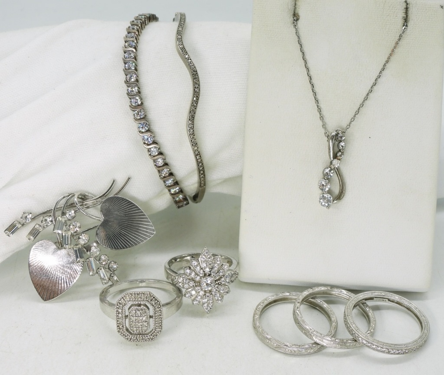 Bridal style sterling jewelry. Five rings, sizes 9 & 11. Sterling brooch, 2″. Sterling 18″ simulated diamond necklace. 2 bracelets. 7″. (31.7 dwt)