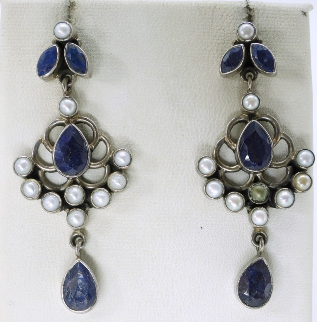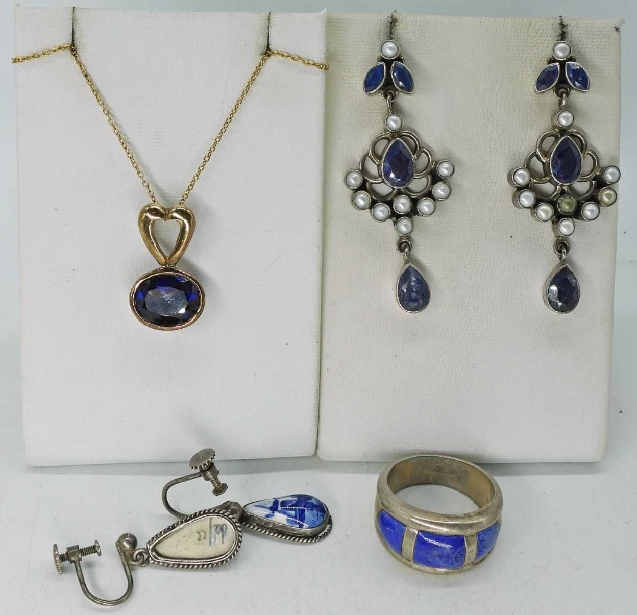 One pair sterling pearl and natural sapphire pierced earrings. Lapis Lazuli ring size 10. Denmark sterling blue and white screw back earrings. Gold tone sterling simulated sapphire necklace, 18″. (21.1 dwt)