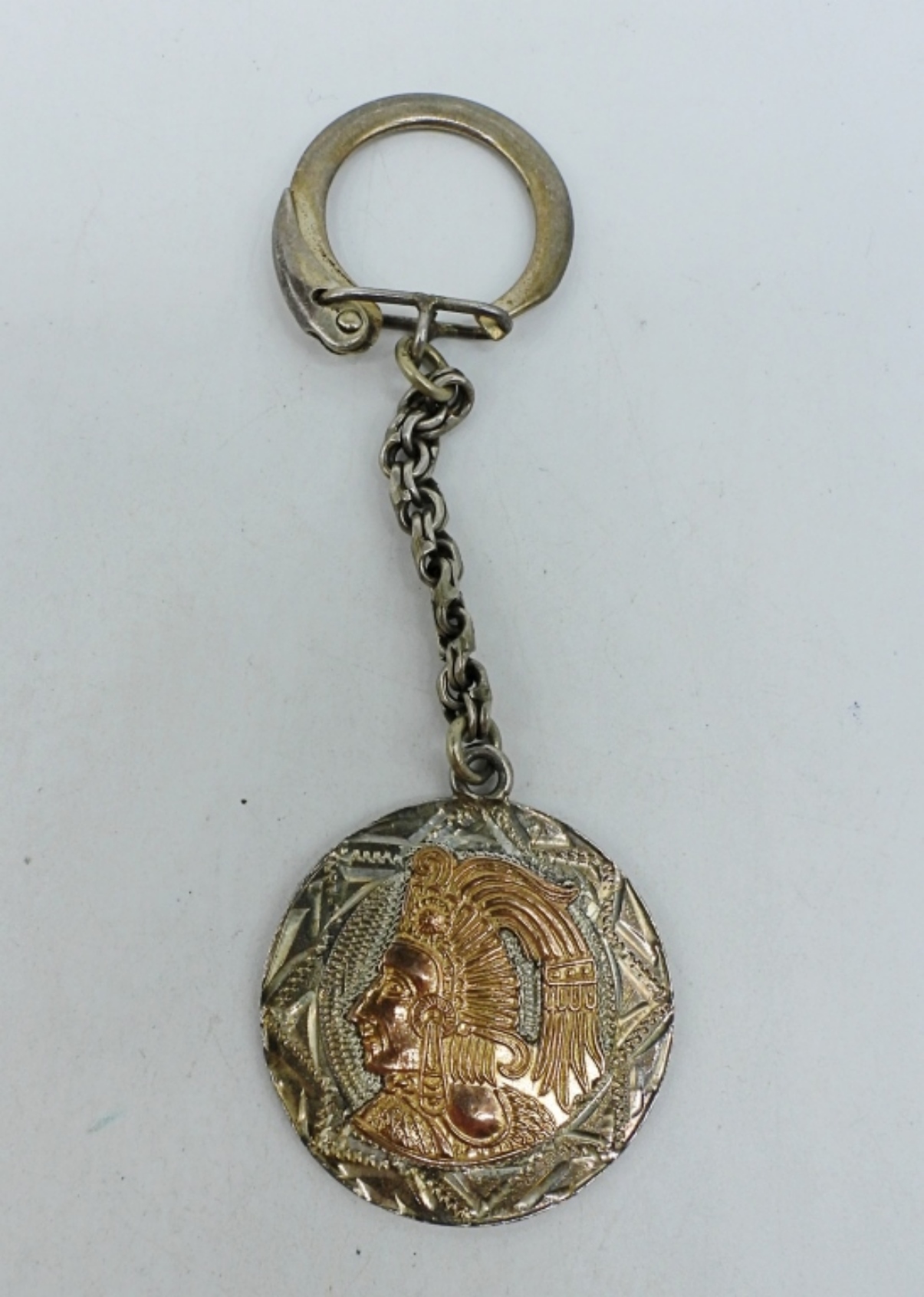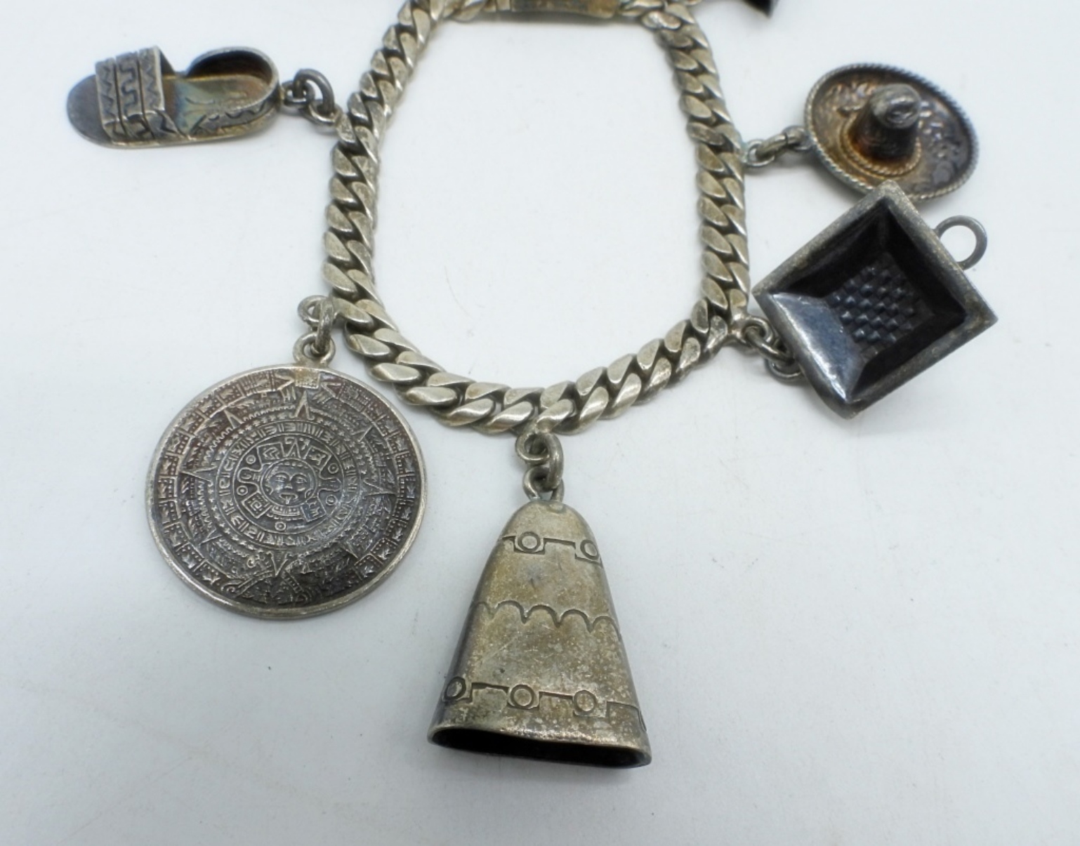 Mexico, Sterling Charm Bracelet 7″. Mayan calendar pierced earrings. Mayan calendar keychain. (42.9 dwt)
