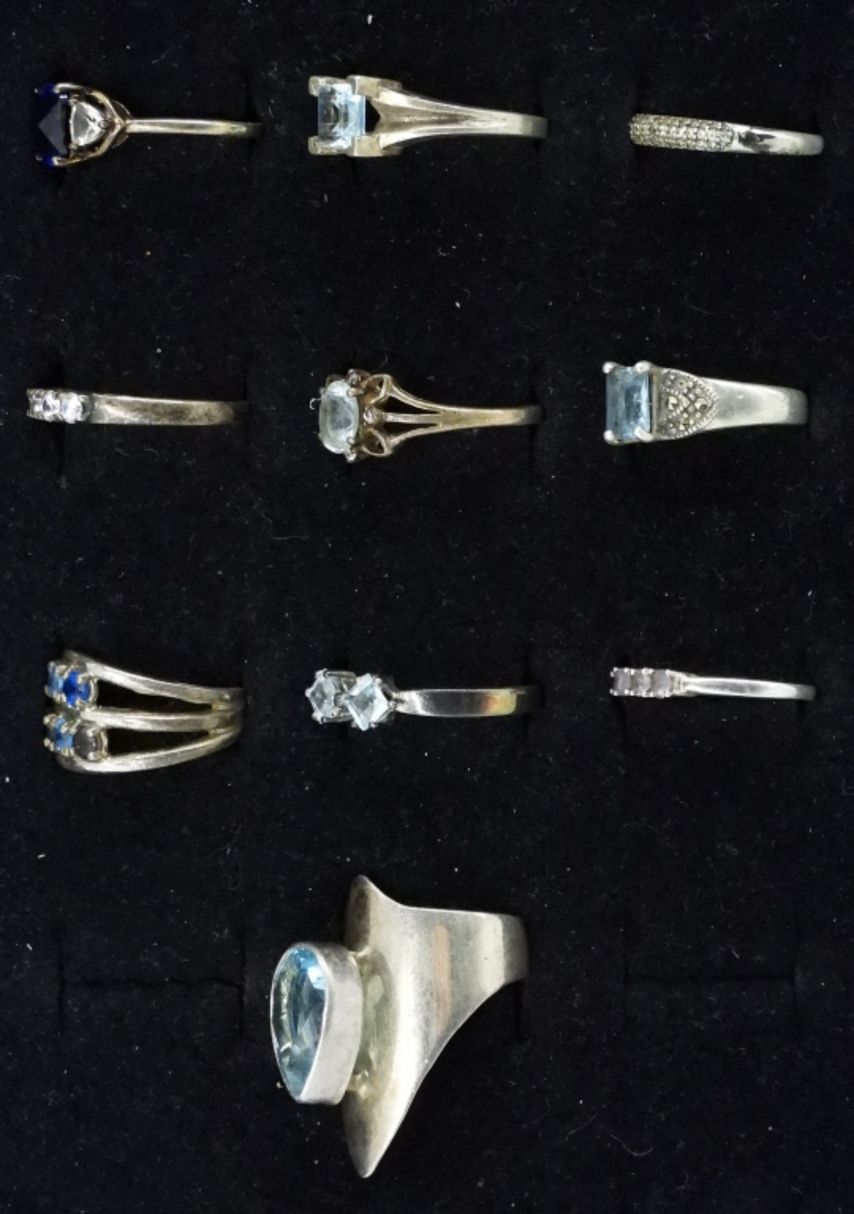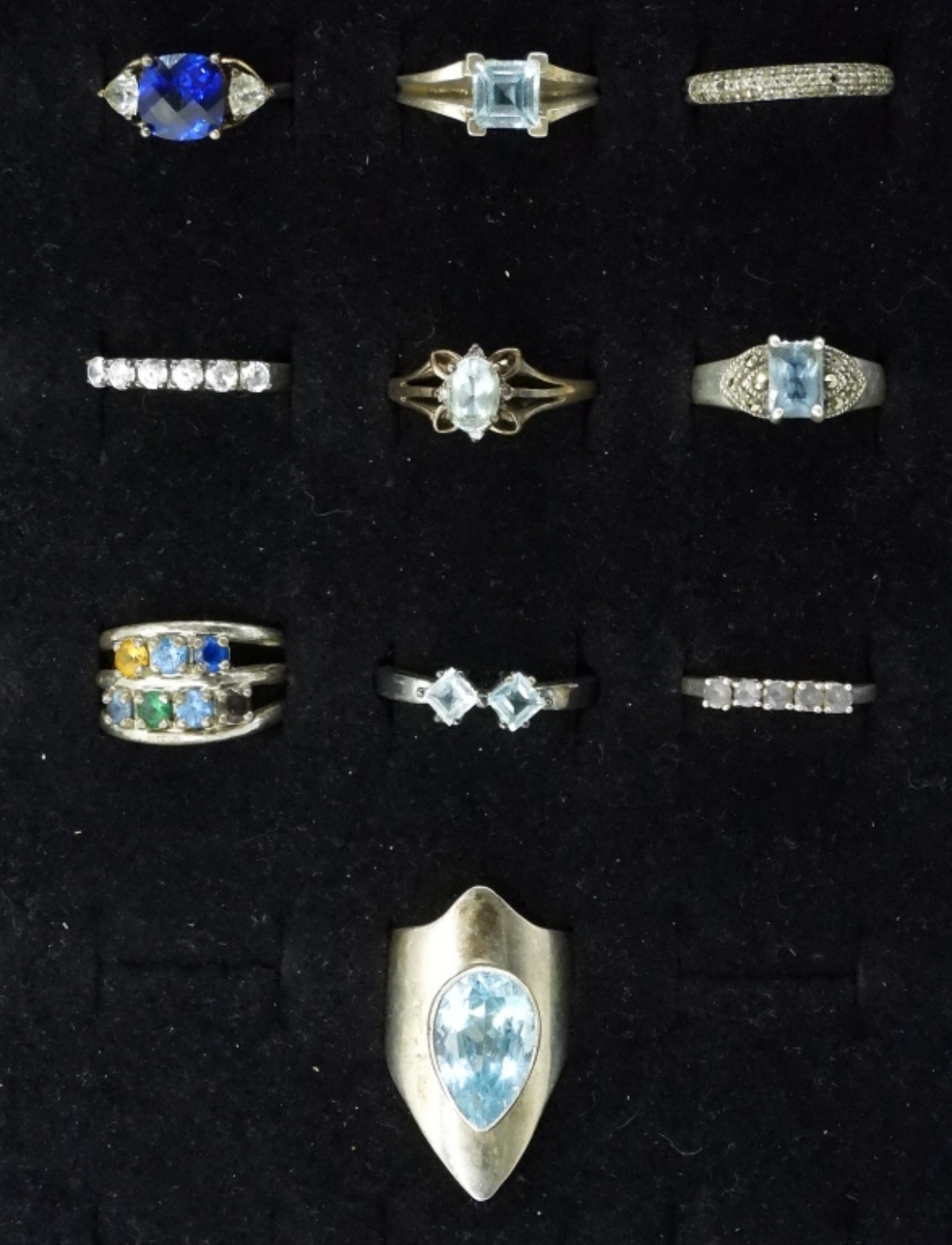 10 sterling fashion rings. Sizes 6-10. Blue topaz, simulated sapphires, simulated diamonds and other. (20.9 dwt)