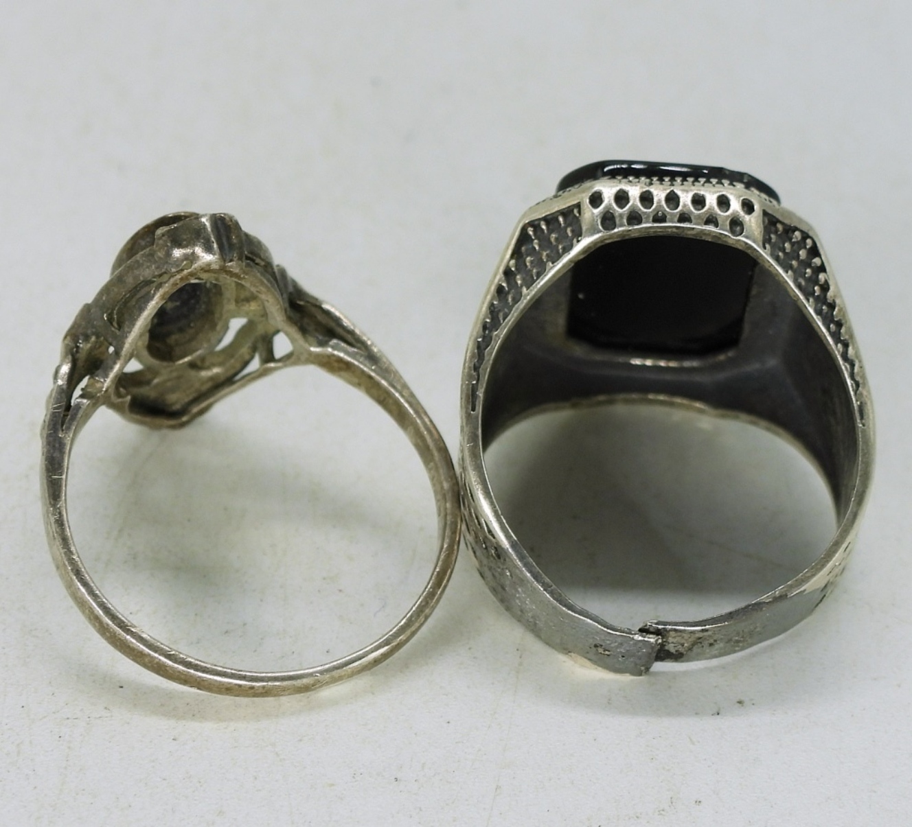 Two sterling rings with black onyx gemstones. Sizes 9. Larger rings band has been cut. Black Onyx necklace is 20″. (28 dwt)