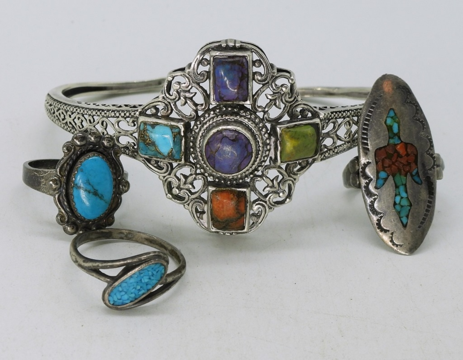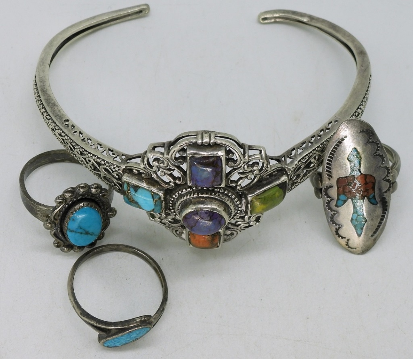 Southwest style cuff bracelet with five gemstones. Three sterling turquoise inlay rings, sizes 6-8. Bracelet is slightly misshaped, see photos. (20 dwt)