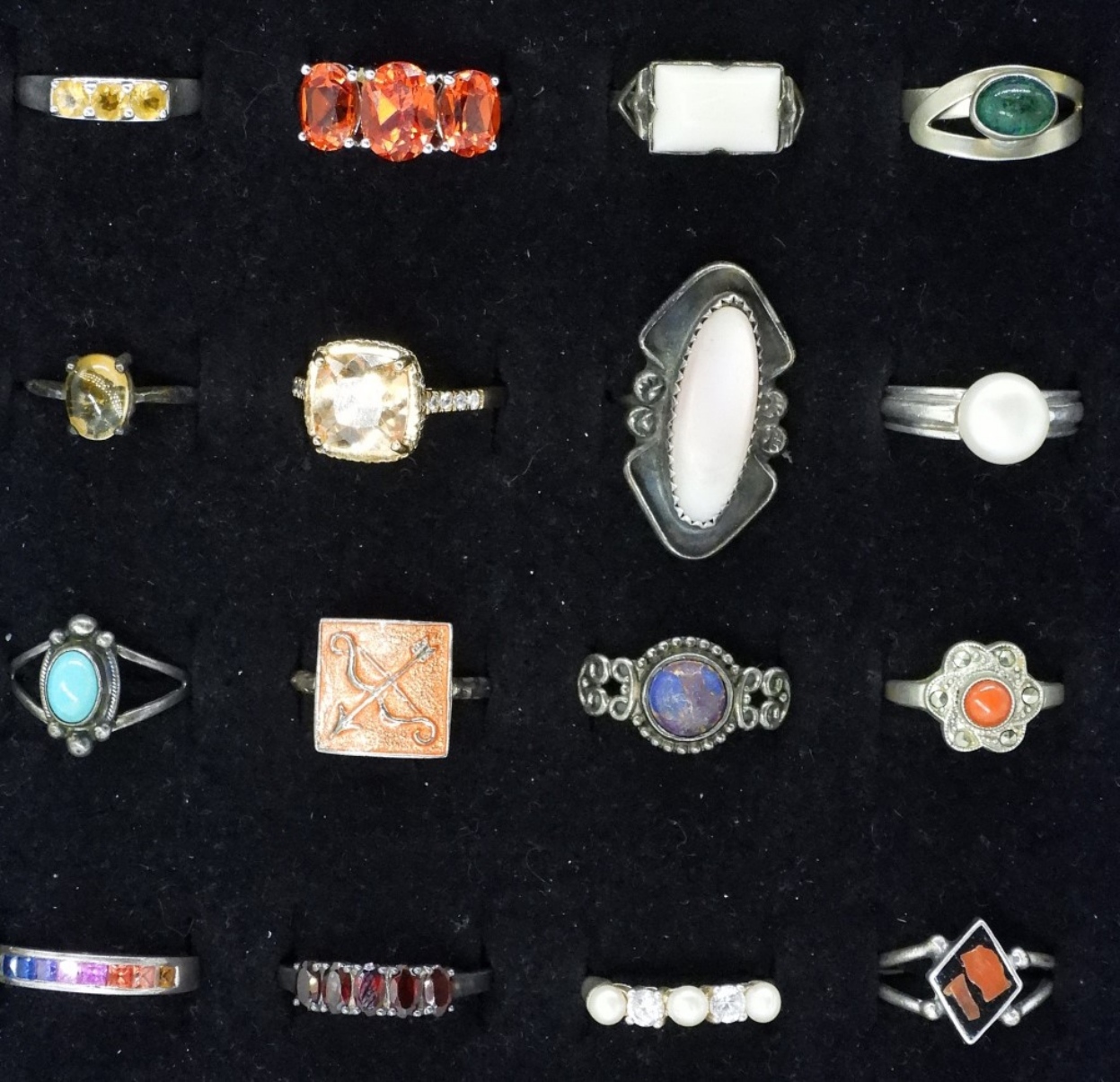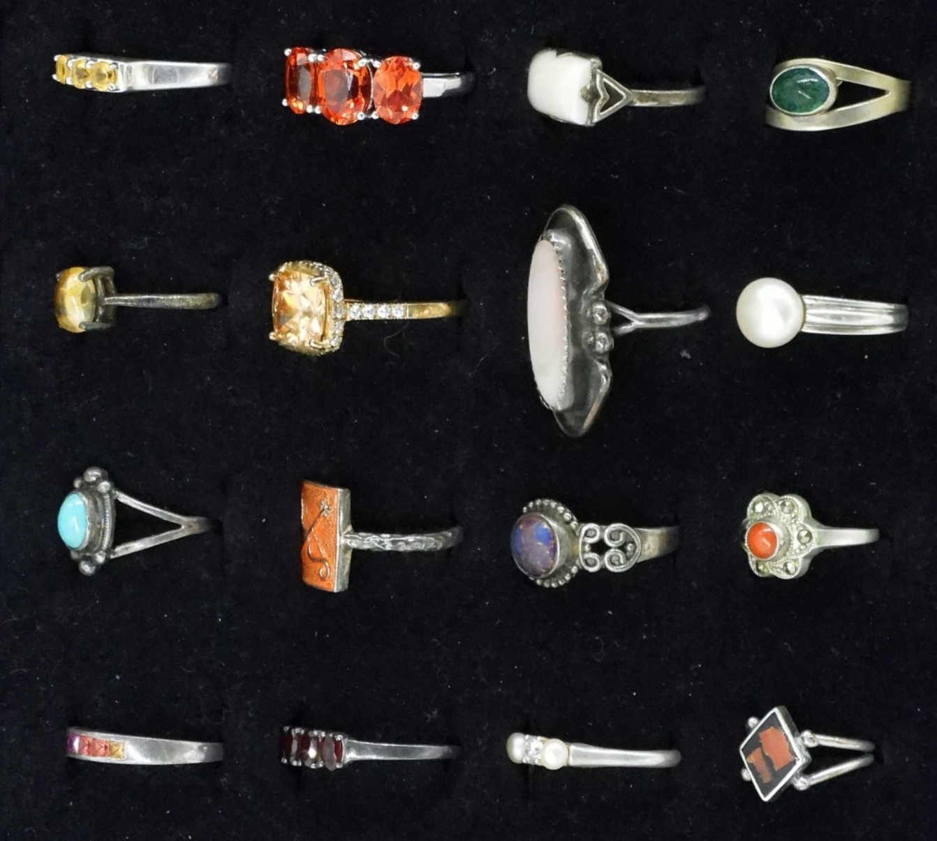 16 Sterling Rings, Sizes 5-9. Various Gemstones. (30 dwt)