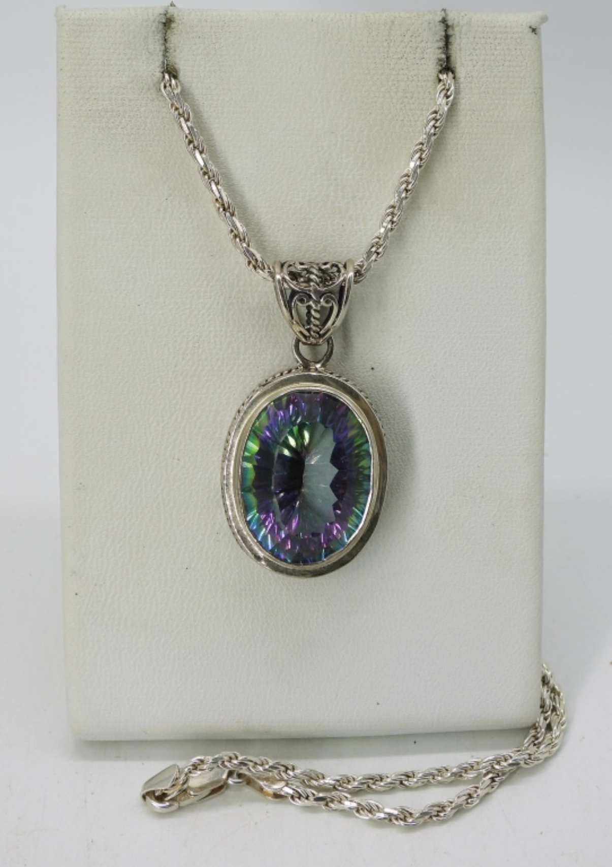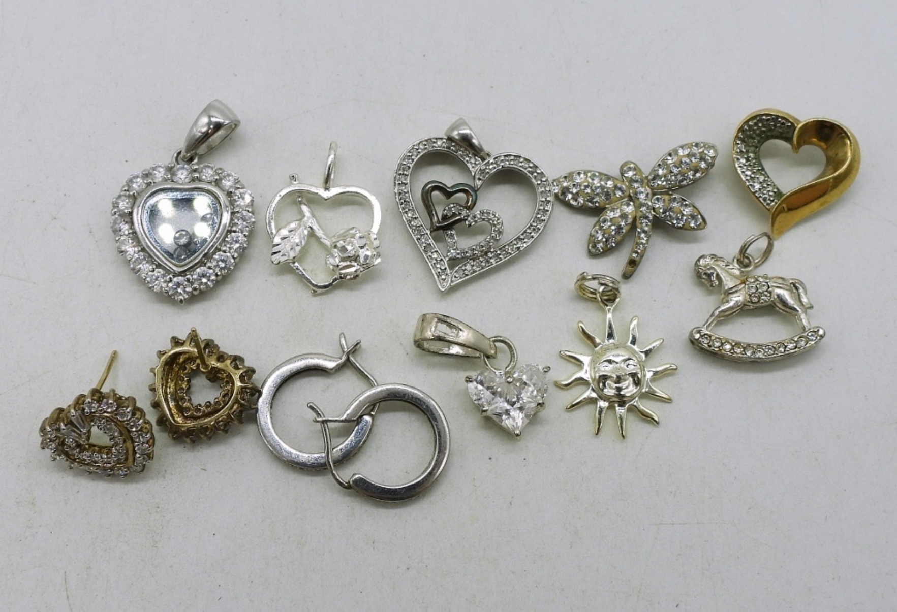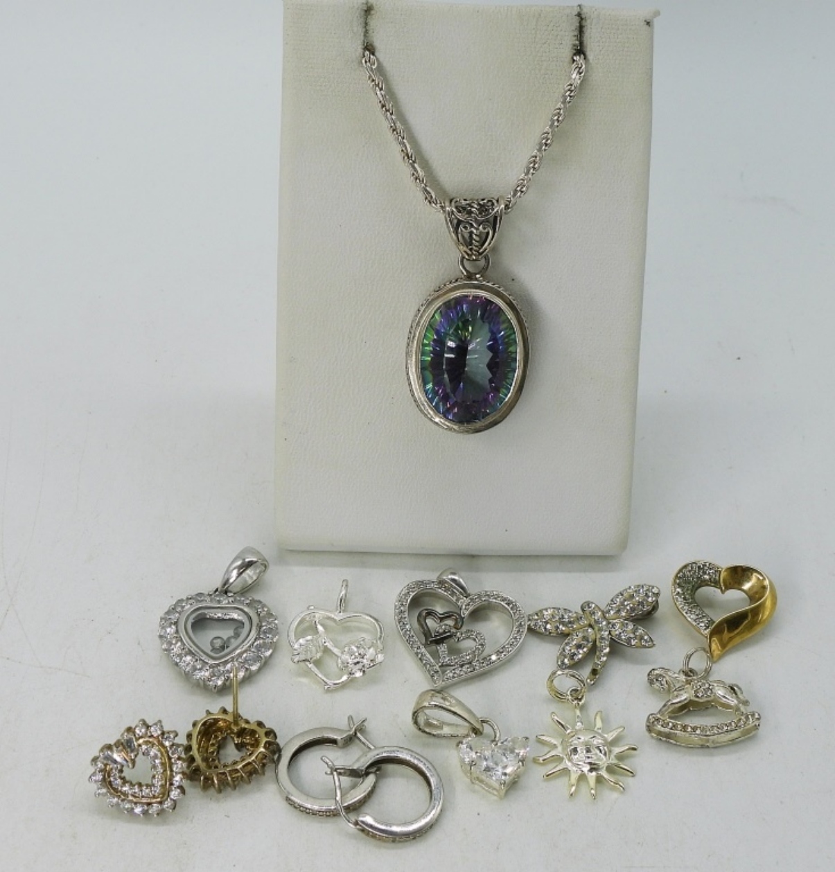 8 loose sterling pendants with simulated diamonds. One large mystic topaz pendant on a 16″ sterling chain. Two pair of pierced earrings. (25 dwt)