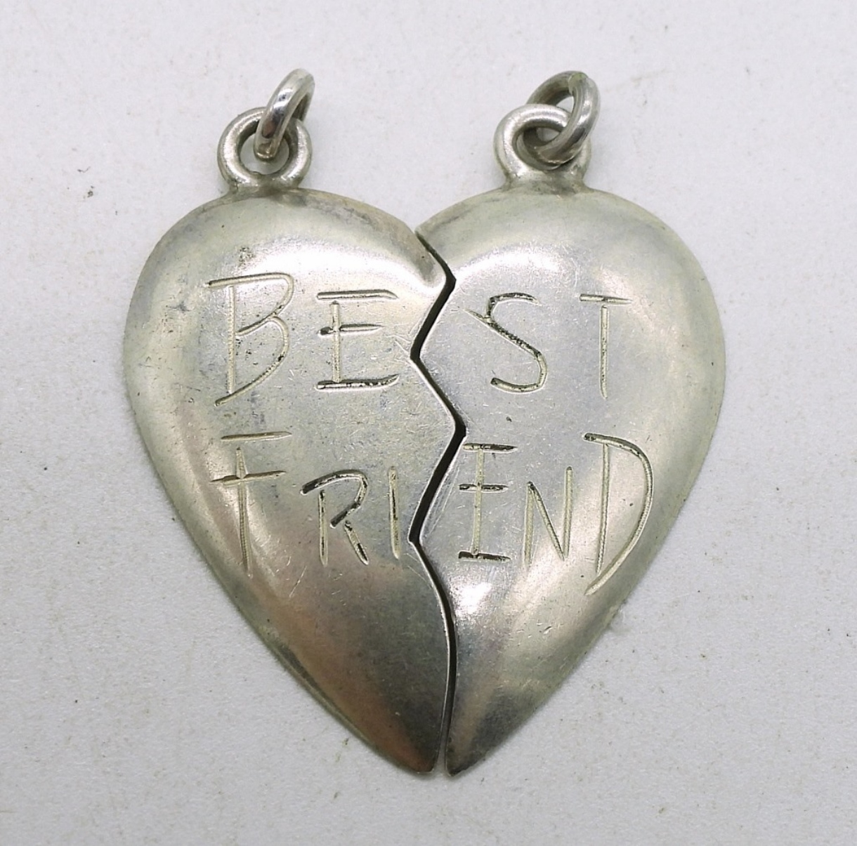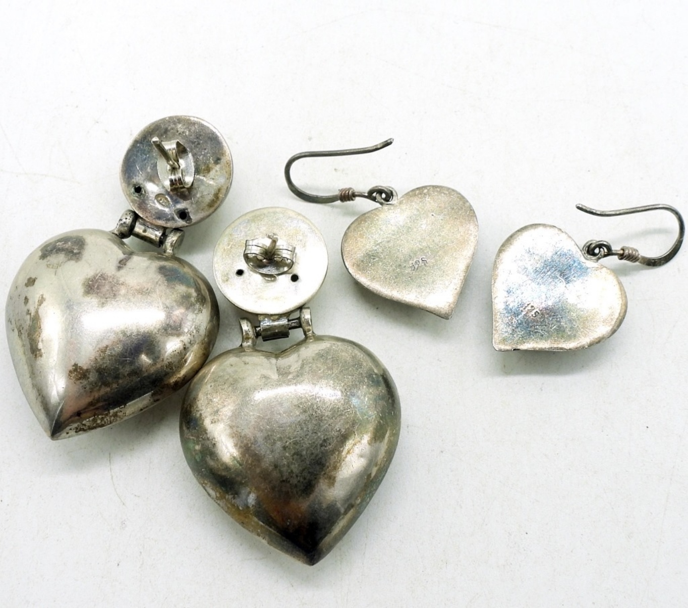 Two pair of sterling heart shaped pierced earrings. Two sterling pendants “Best Friends”. (16.9 dwt)