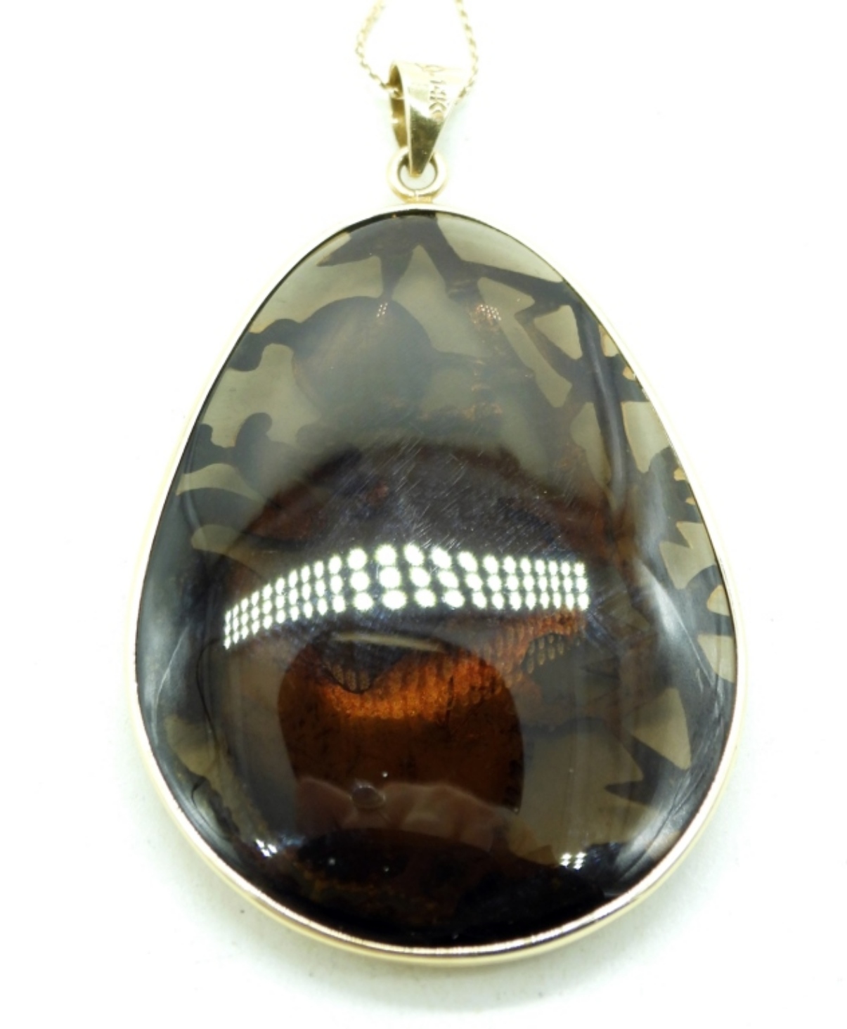 14K Yellow Gold 18″ Chain. With a 2″ long smokey quartz pendant covered in a thin 14k yellow gold filigree Tiger design. Gold weight is approximately 1.7 dwt.