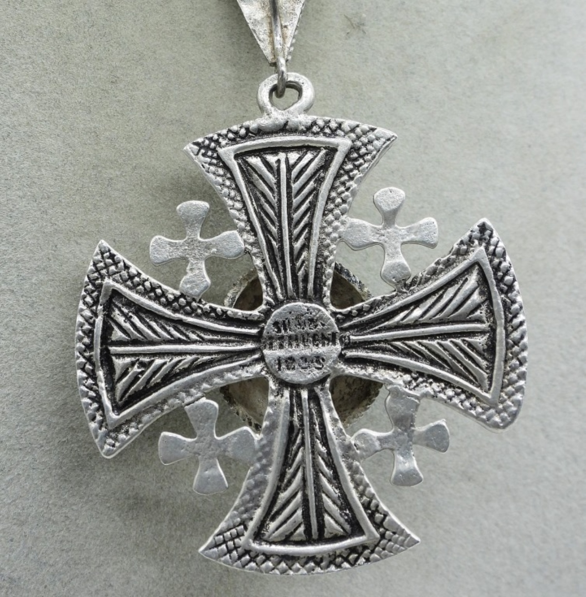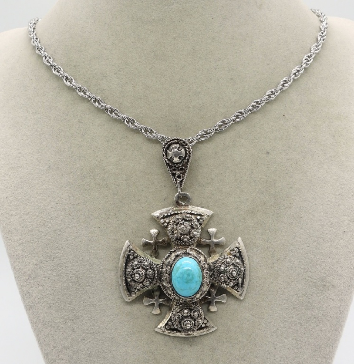 26″ sterling chain with a large Jerusalem cross pendant. Turquoise center stone. Pendant measures 3″. (36.8 dwt)