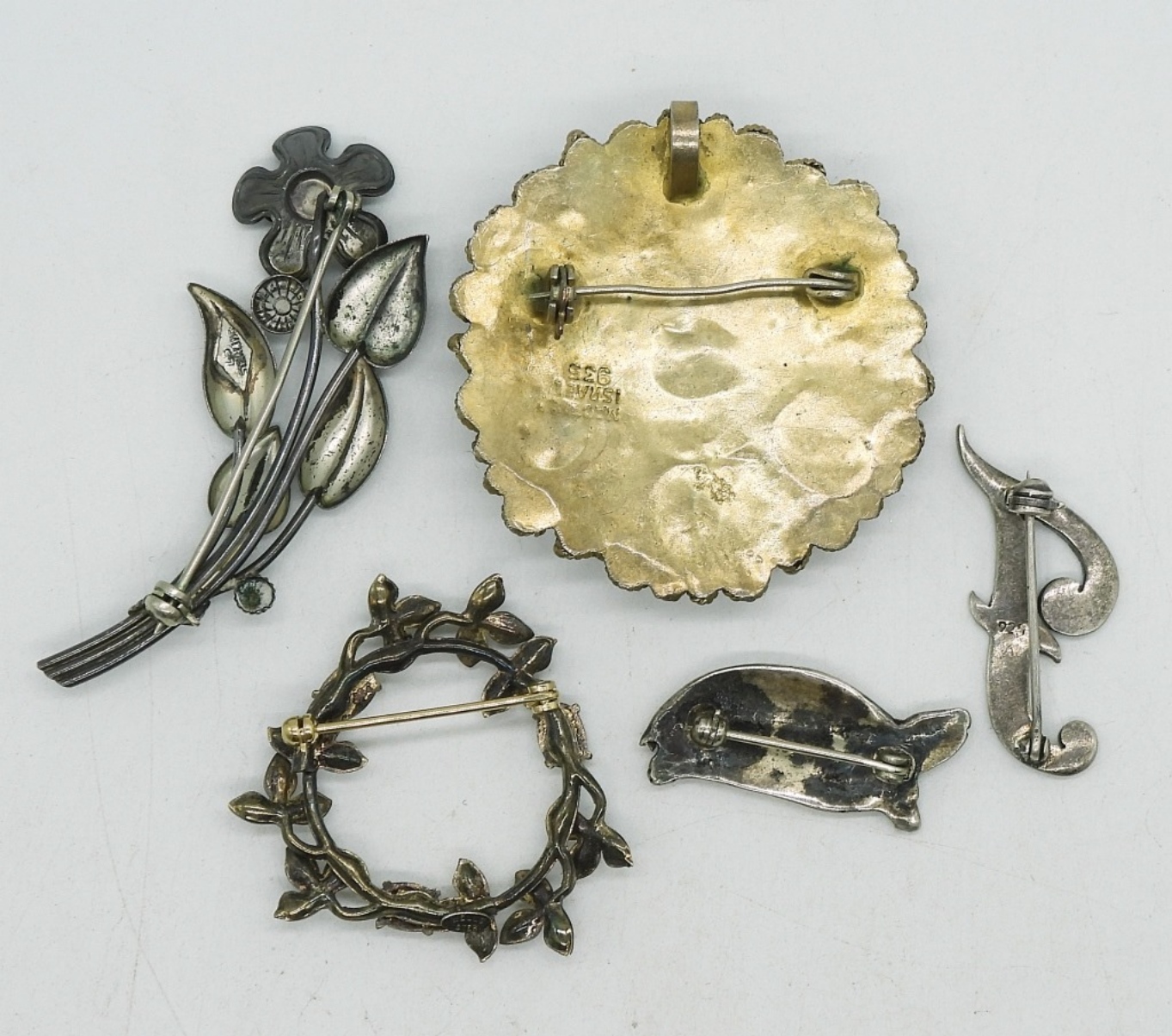 Five sterling brooches. Amethyst and Opal Gemstones. 1″-2.5″. (21.8 dwt)