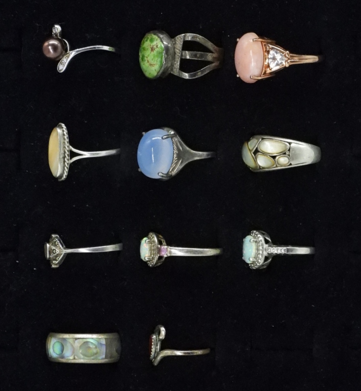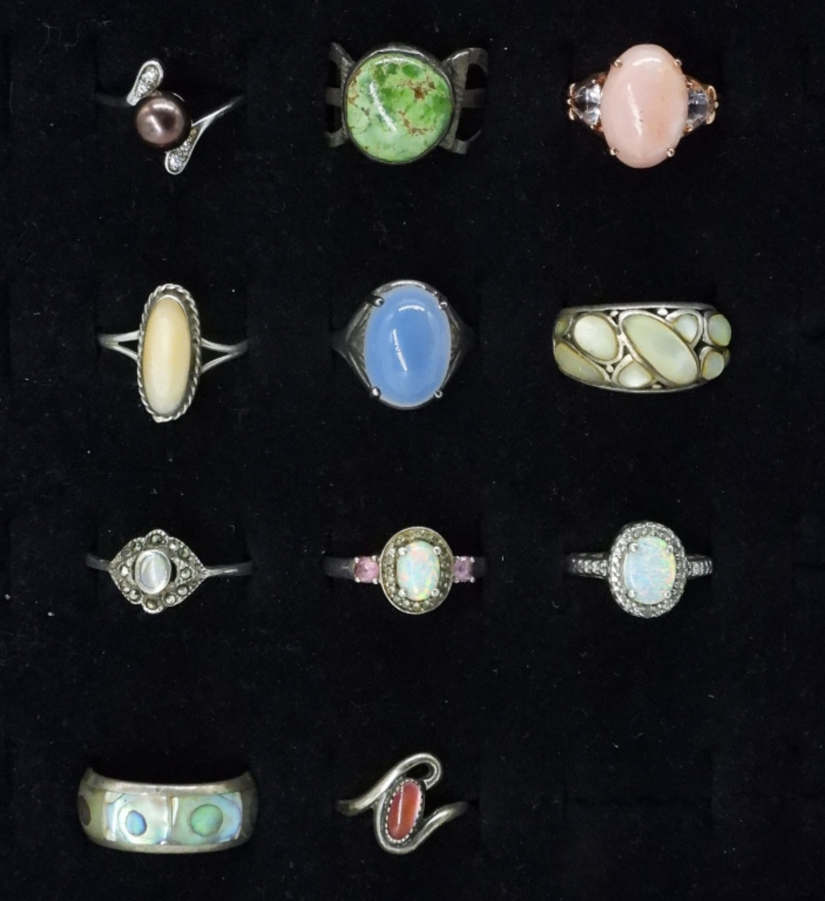 Sizes 4-9. Eleven sterling fashion rings. Opal, Turquoise, Pearl, Mother of Pearl and more. (23.8 dwt)