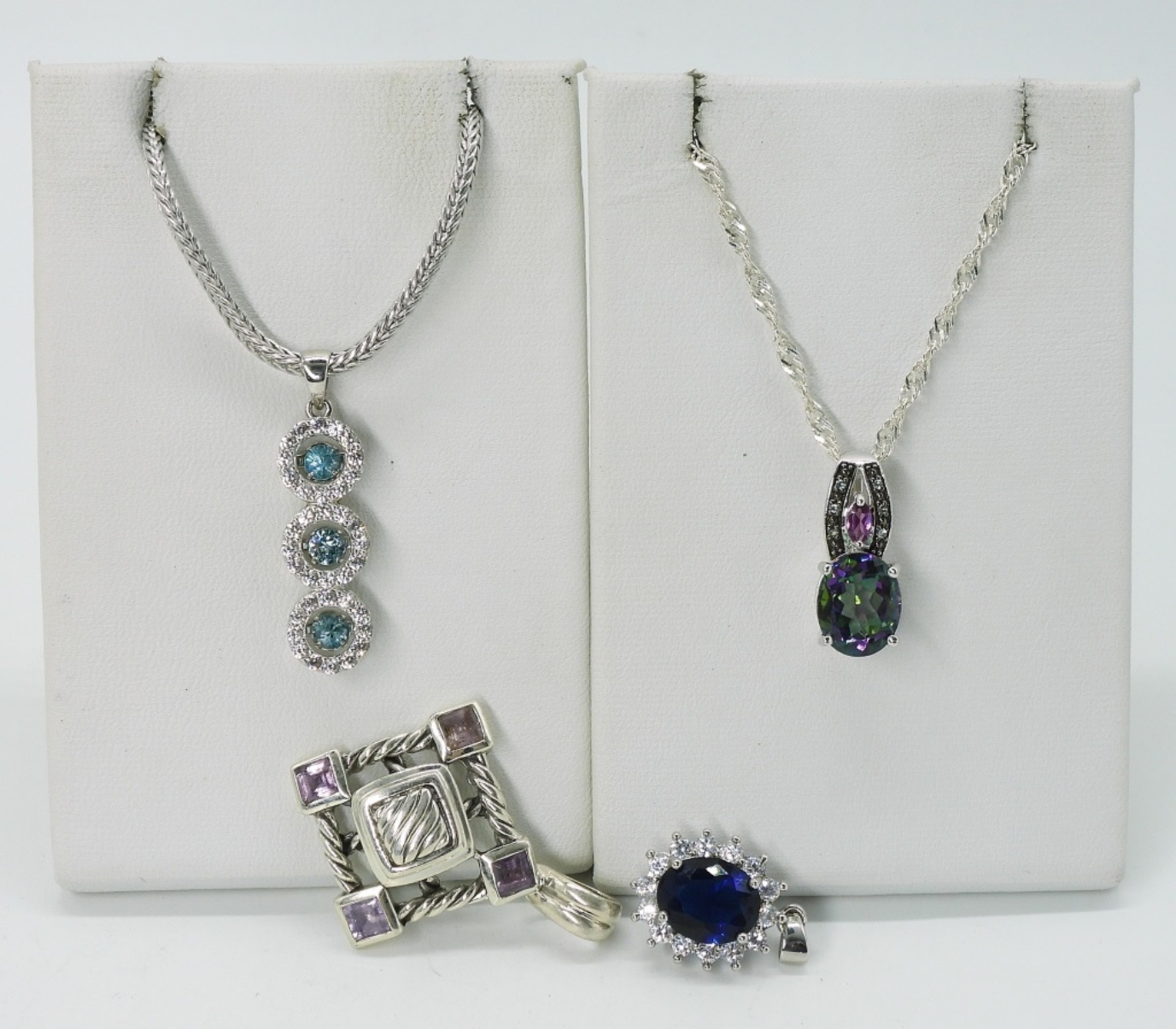 Four Sterling Pendants. Two Sterling Chains, 18″ & 24″. Four pendants, 1″ -1.5″. Amethyst, Mystic Topaz, Simulated Sapphire, Simulated Diamonds. (20.1 dwt)