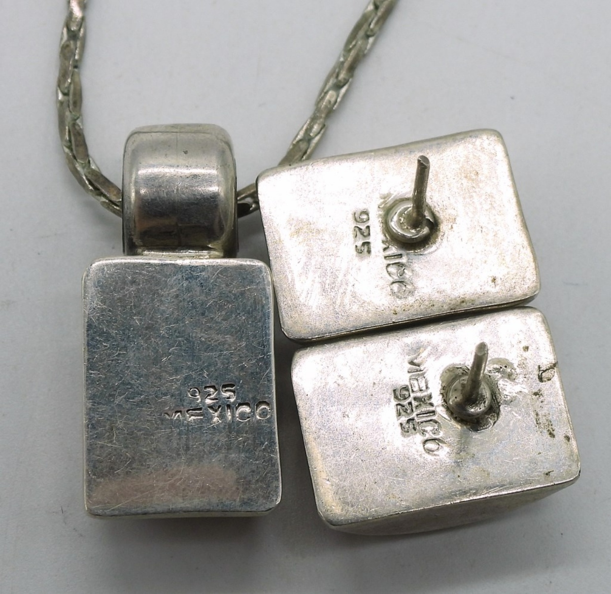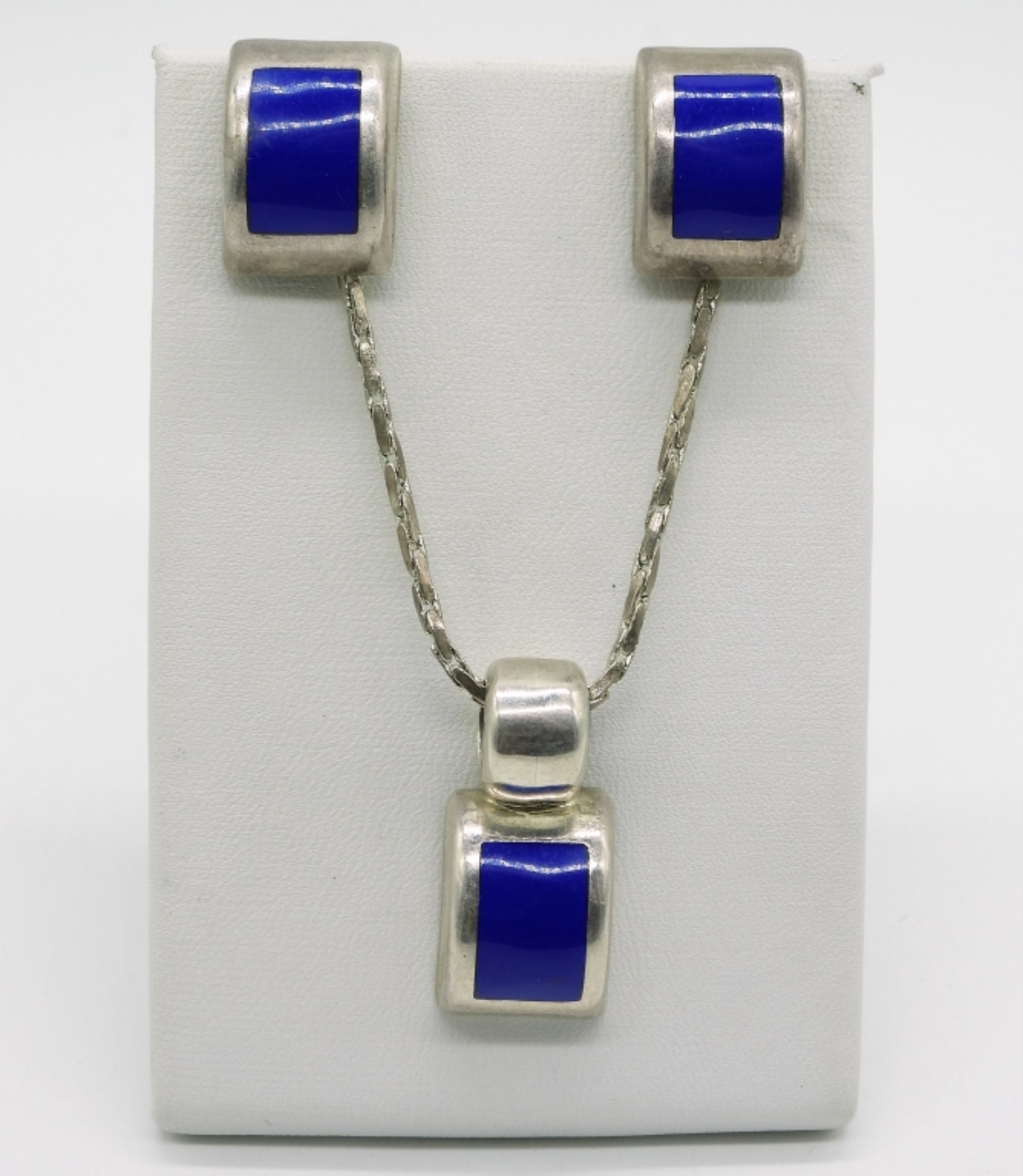 Matching sterling, Mexico, Lapis Lazuli pendant and pierced earrings. Chain is 24″. (19.7 dwt)