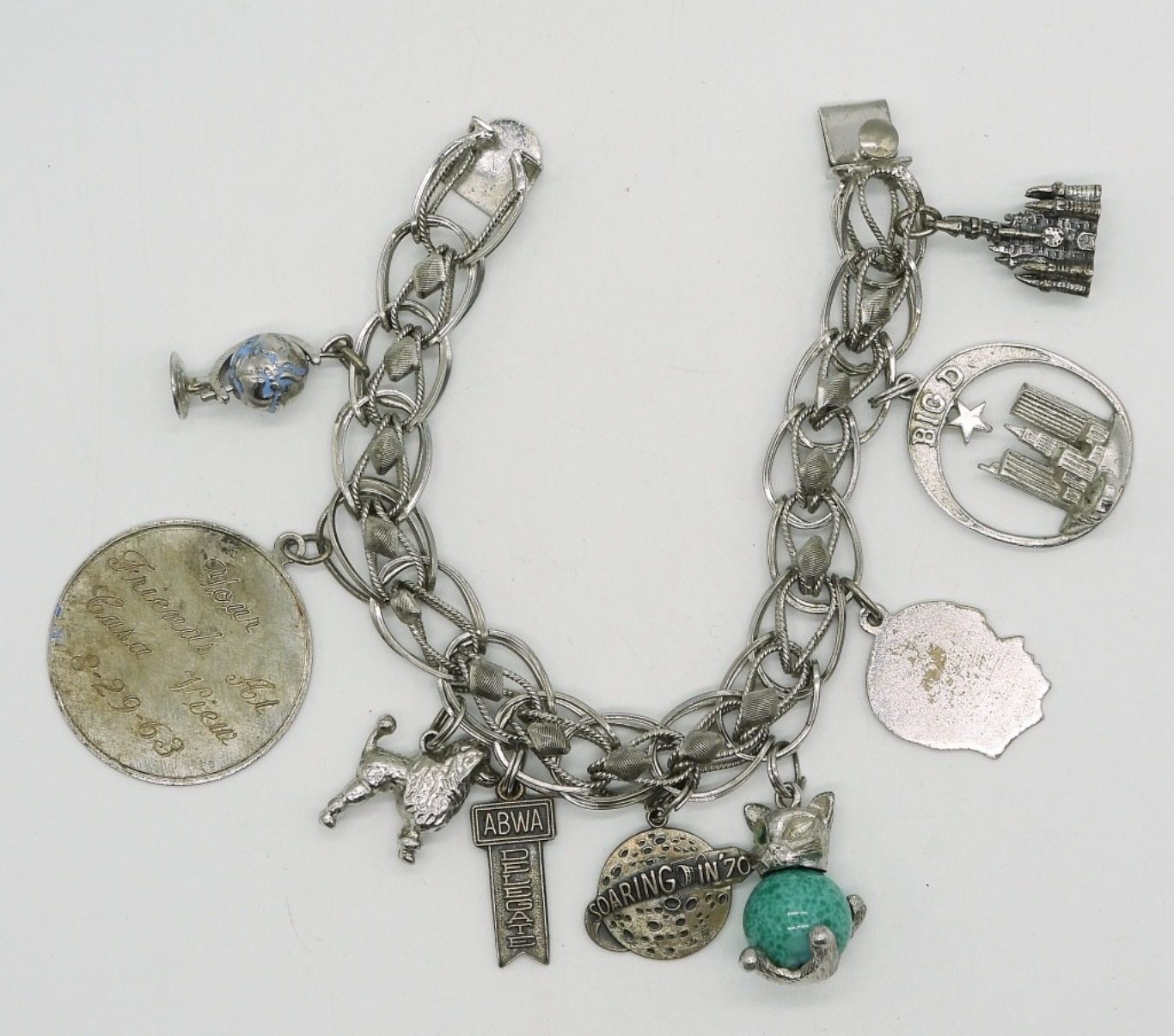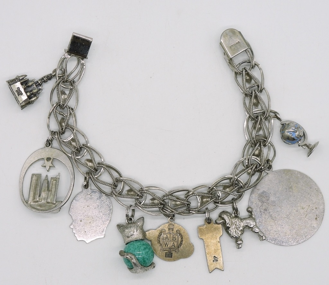 Vintage sterling charm bracelet, 9 charms. 7.5″ long. (38.3 dwt)