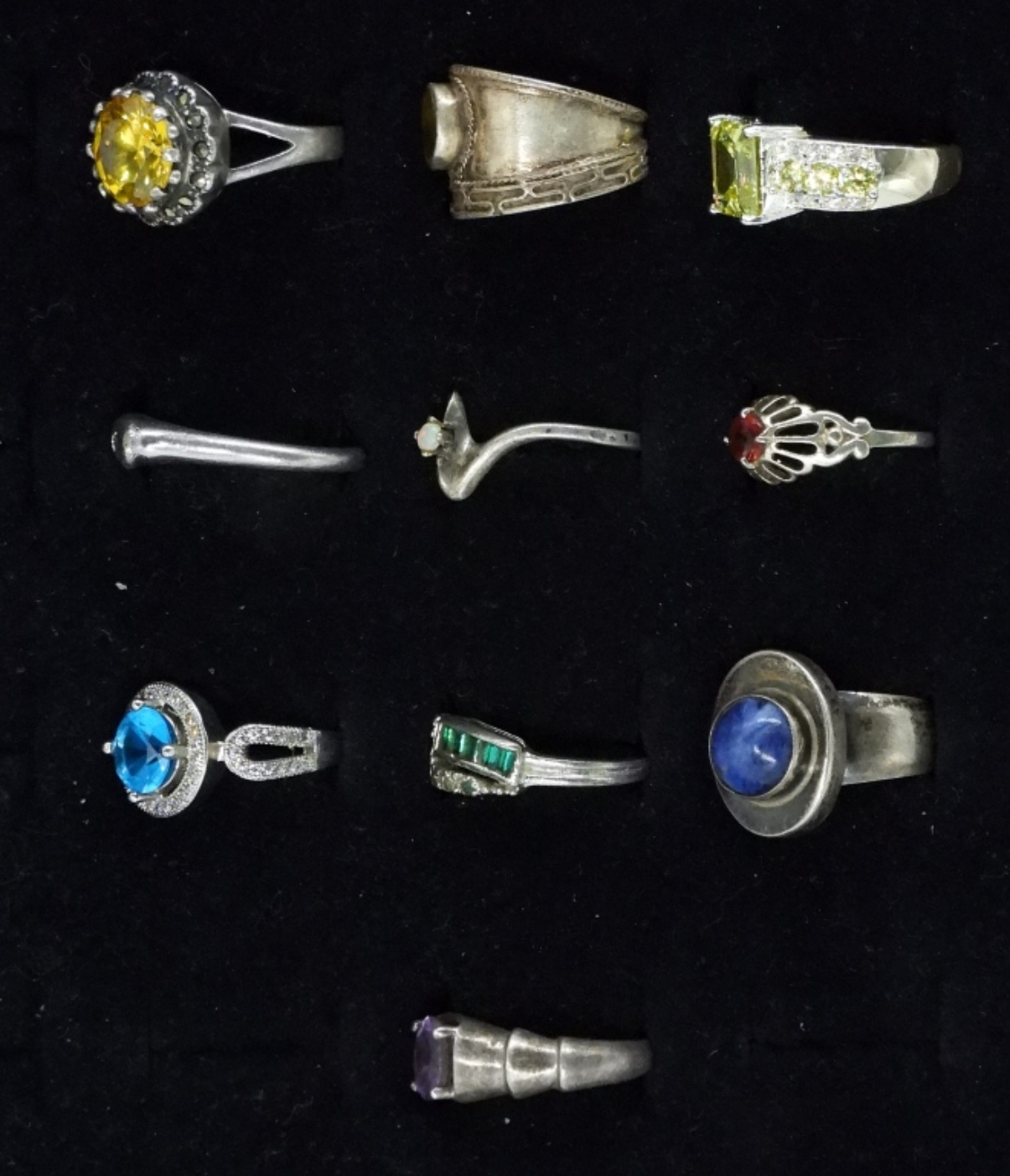 Ten sterling gemstone rings, sizes 6-10.5 Amethyst & Simulated Gems. (24.2 dwt)