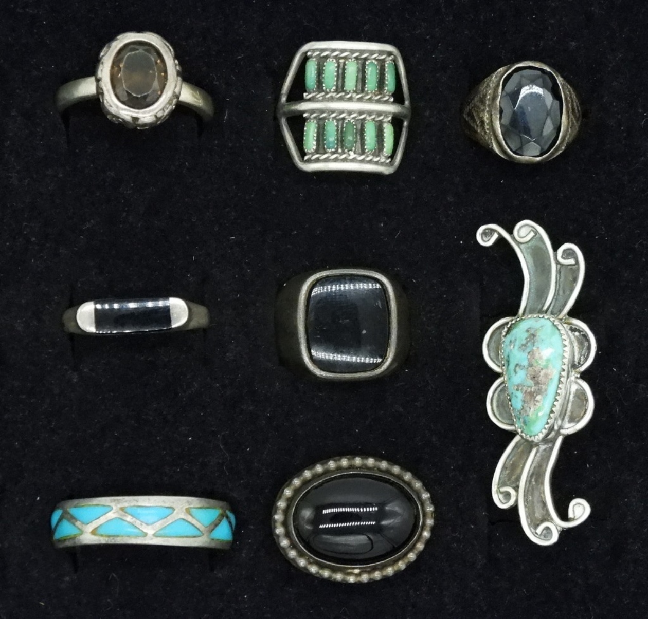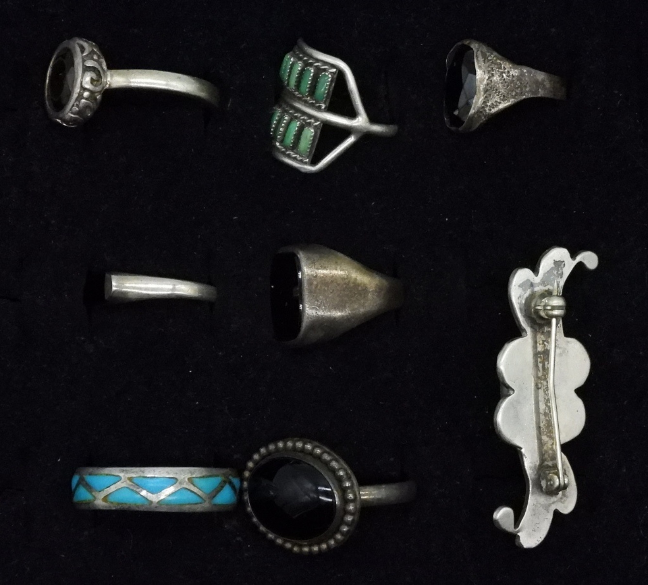Severn sterling rings with turquoise, hematite & black onyx. Sizes 5-13. Turquoise sterling pin, 2″ wide. (26 dwt)