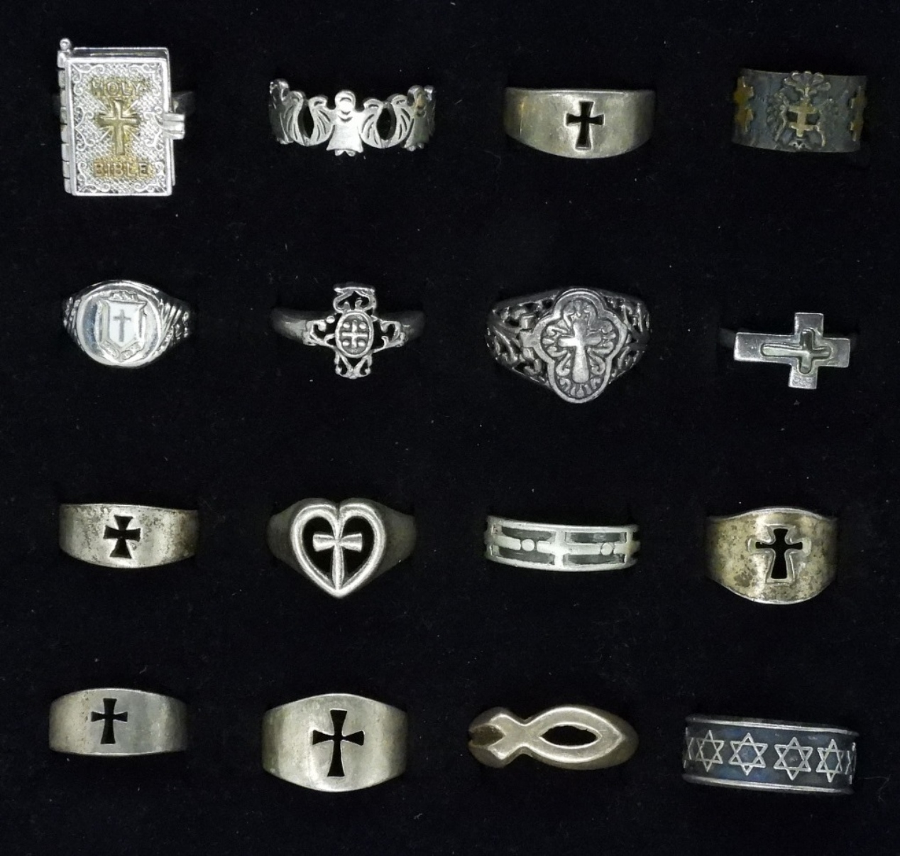 16 sterling rings. Mixed religious lot. Sizes 4-10 (52.5 dwt)