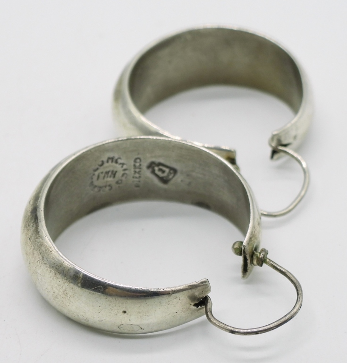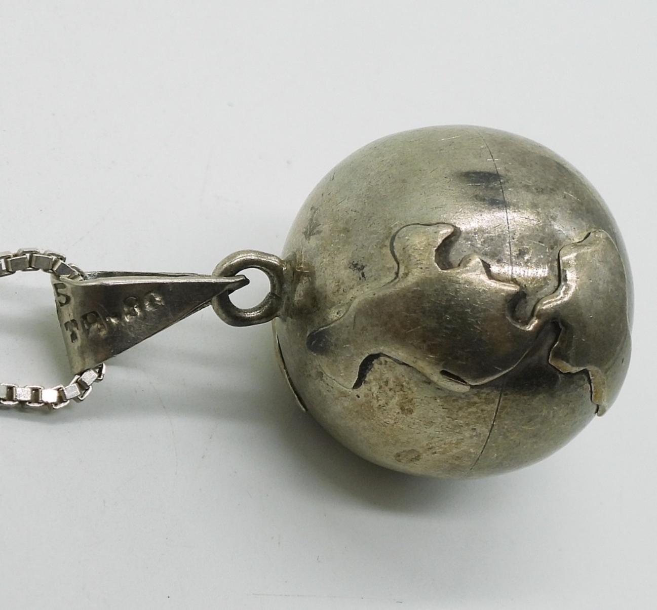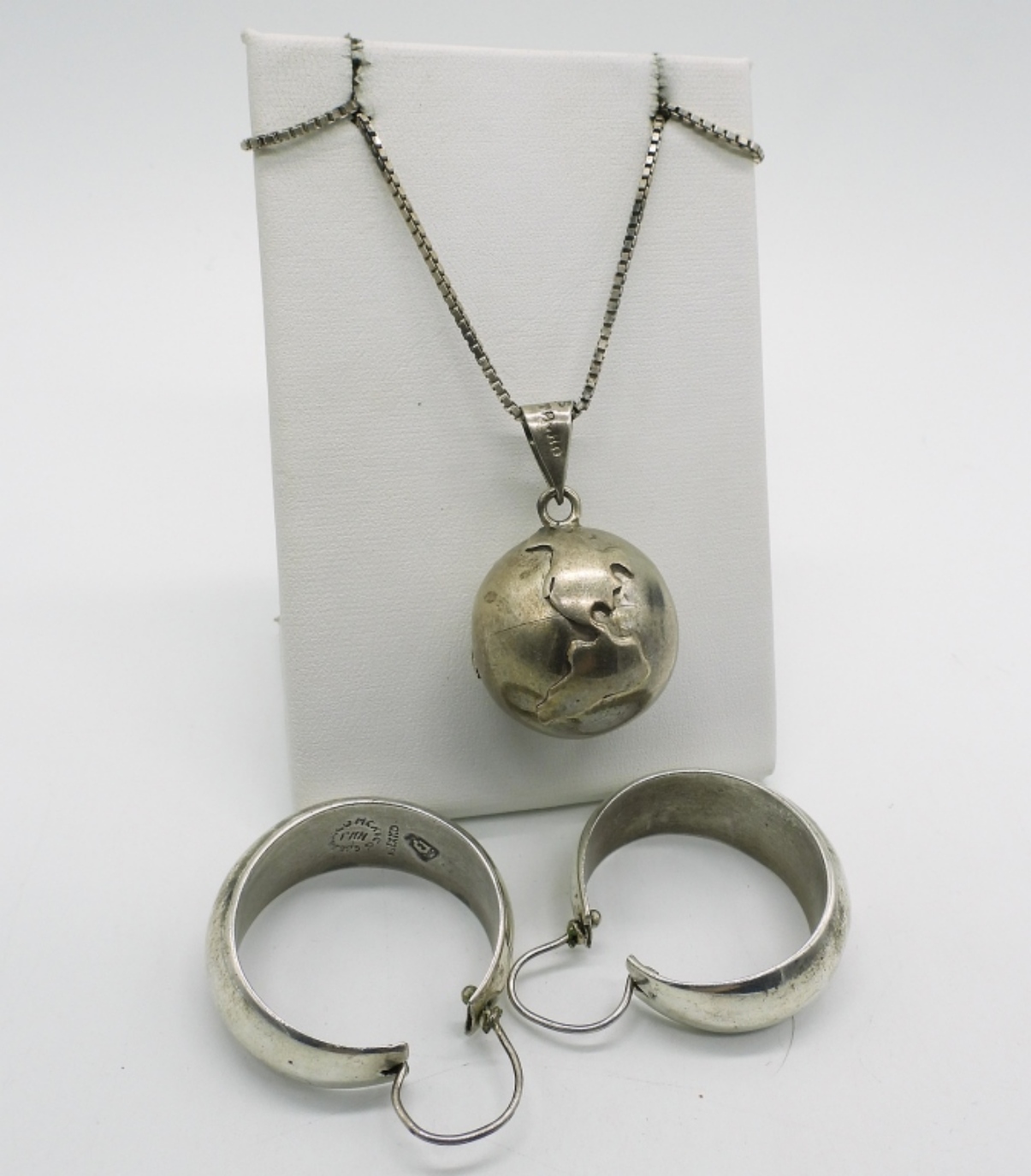 Harmony Ball Globe Necklace, 23″. Mexico sterling pierced hoop earrings, Mexico. (20.5 dwt)