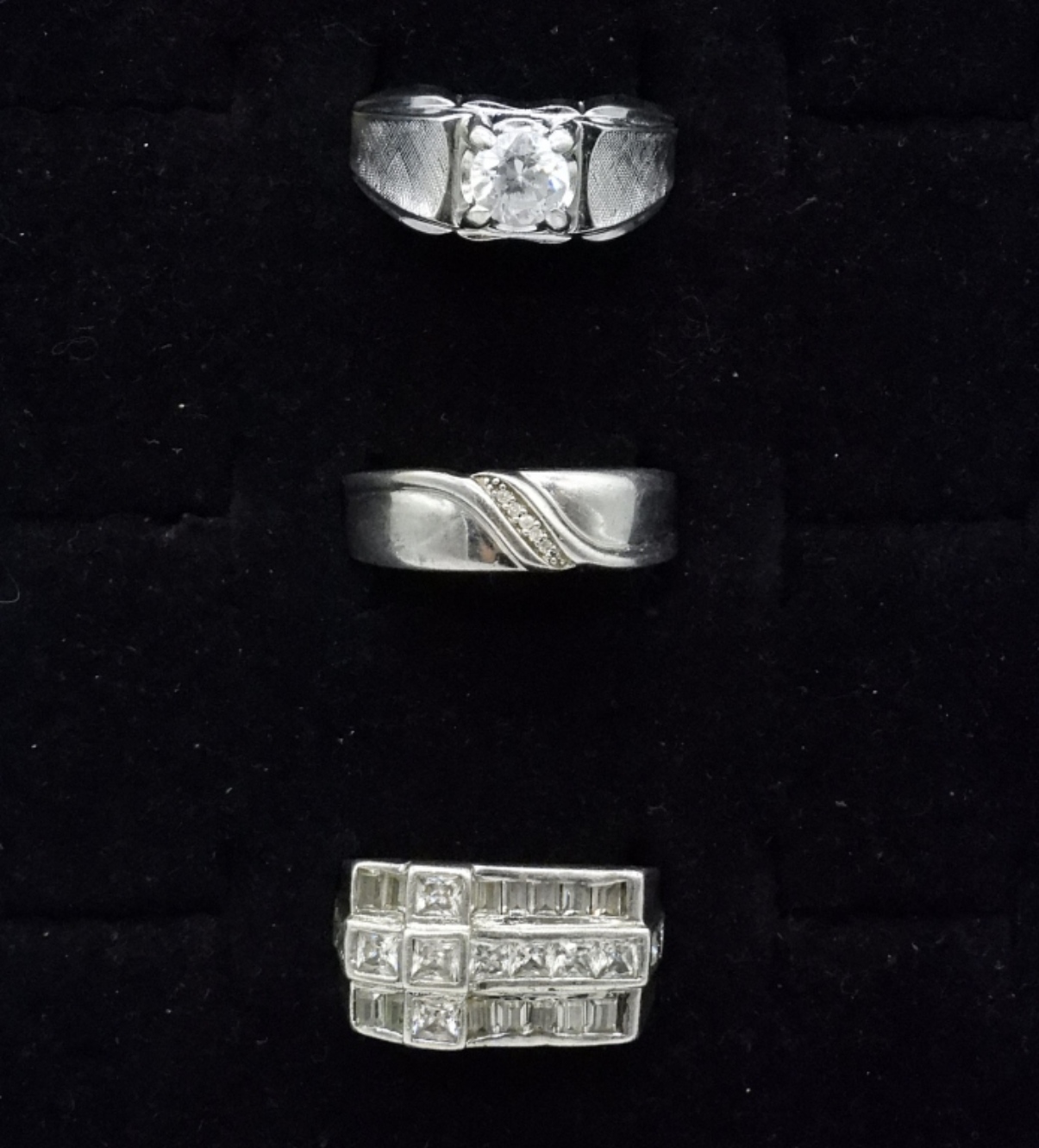 Three sterling men’s rings with simulated diamonds. Sizes 10 & 11. (15.1 DWT)