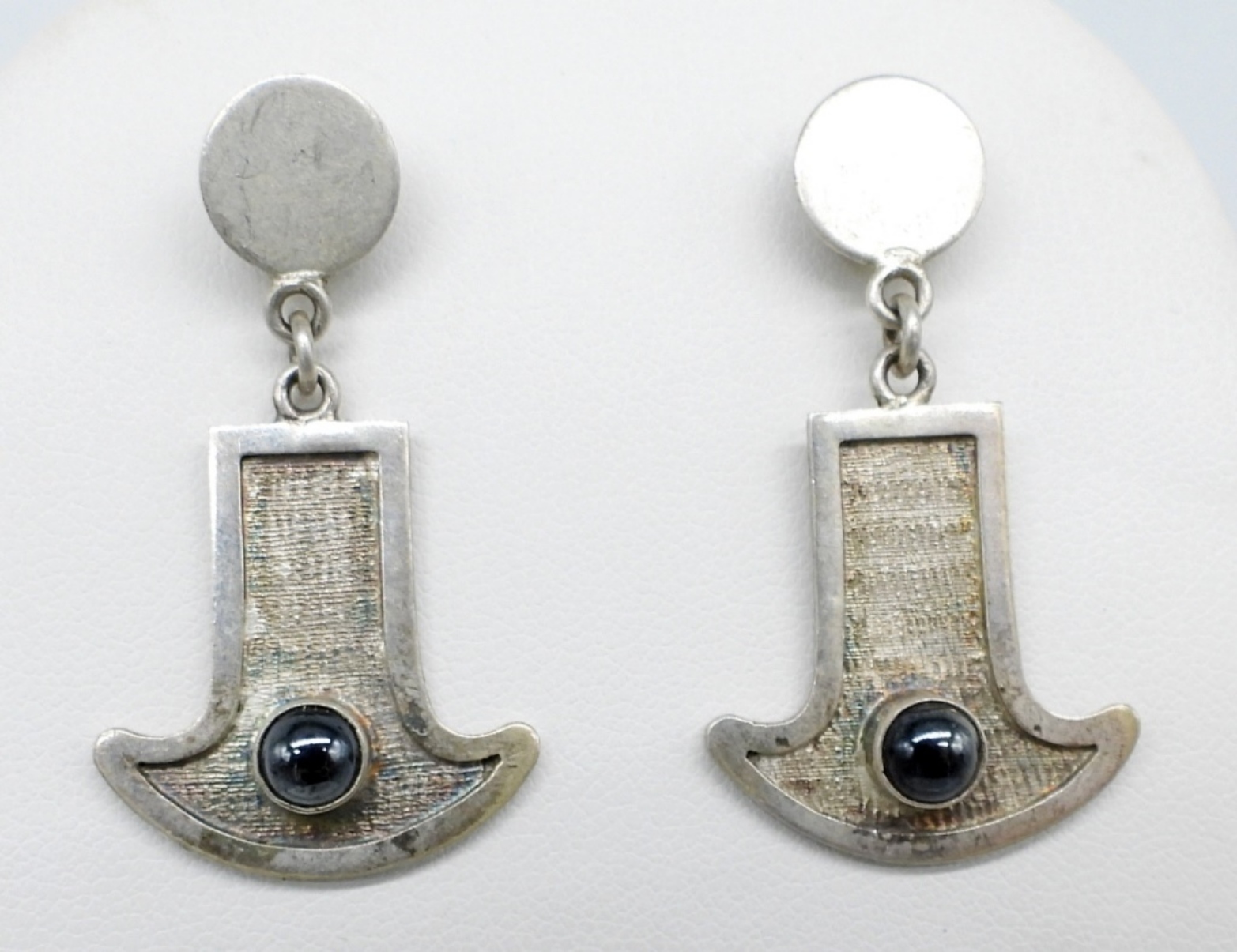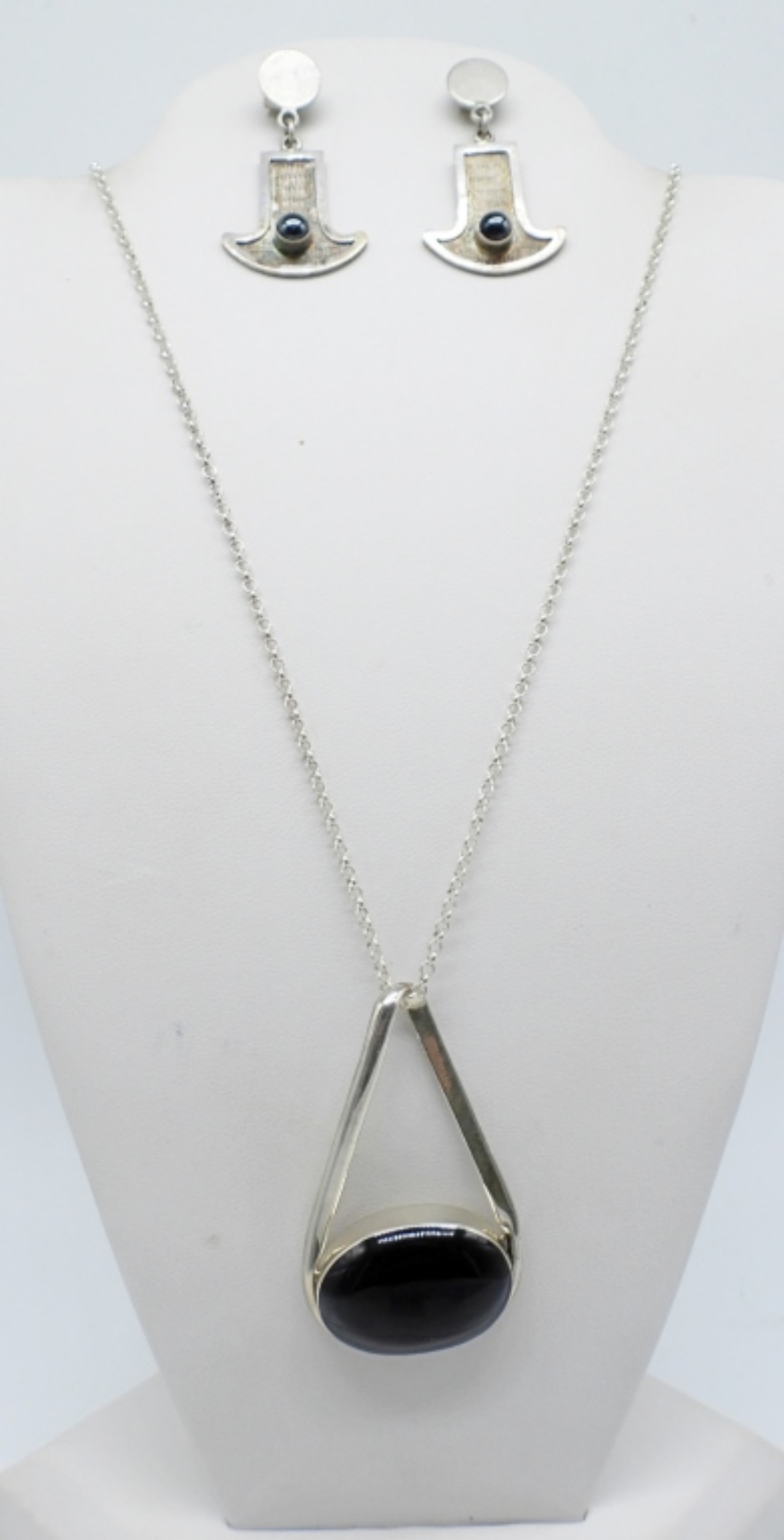 Black onyx necklace, 20 “. One pair pierced sterling, black onyx earrings. (15 DWT)