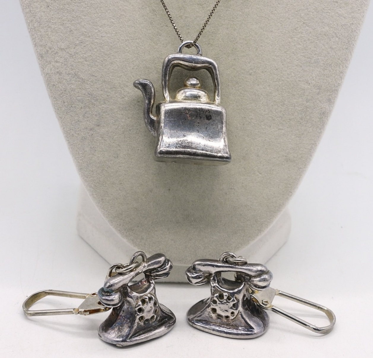 Two puffed sterling telephone keychains, 3″ long. Puffed sterling tea kettle pendant on a 24″ chain. (30.1 DWT)