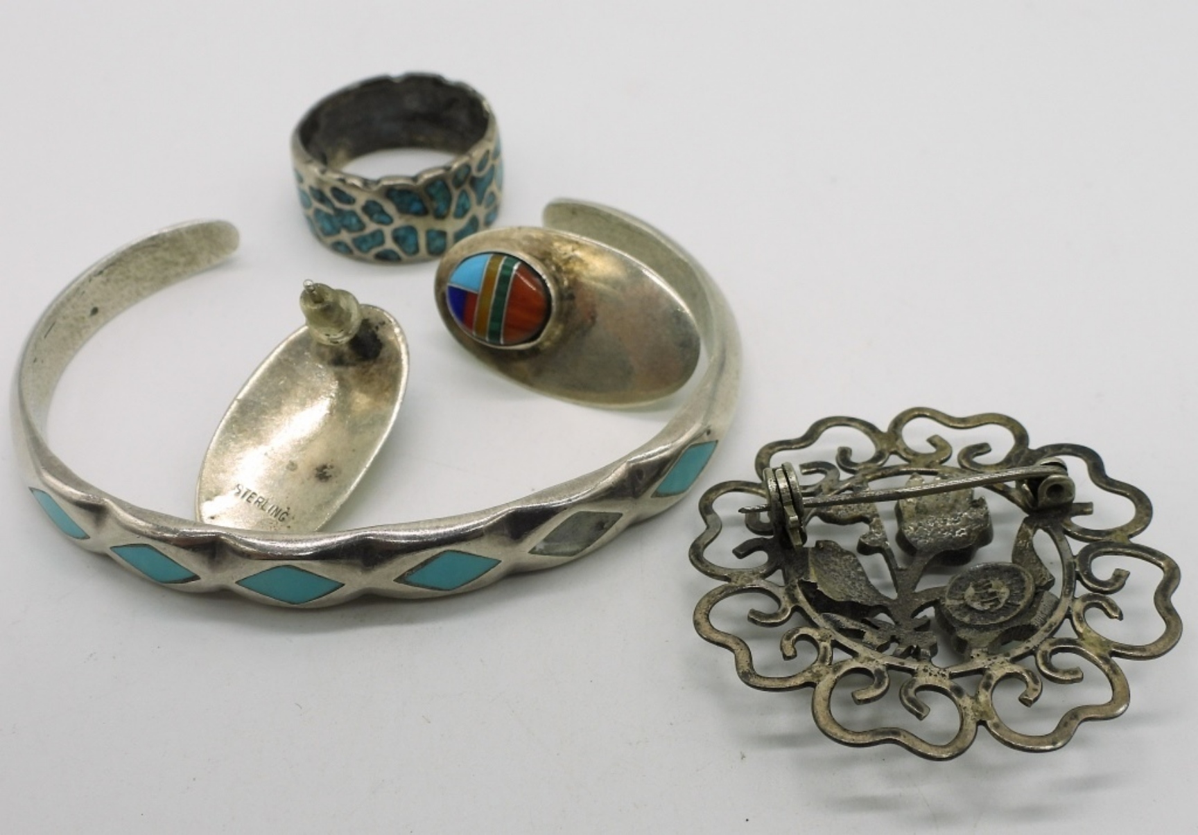 Cuff bracelet with light blue turquoise, one missing. Brooch and Ring, size 7. Pierced Earrings. (21.6 dwt)