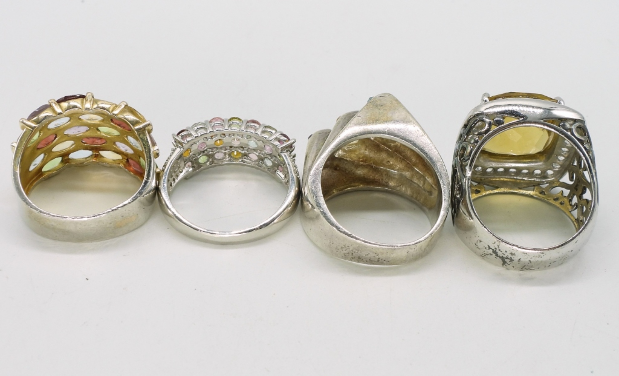 Four sterling rings, sizes 7-9. Citrine, Amethyst, Garnet, Peridot, Blue Topaz. Bracelet is 7.5″ long. (28.4 dwt)