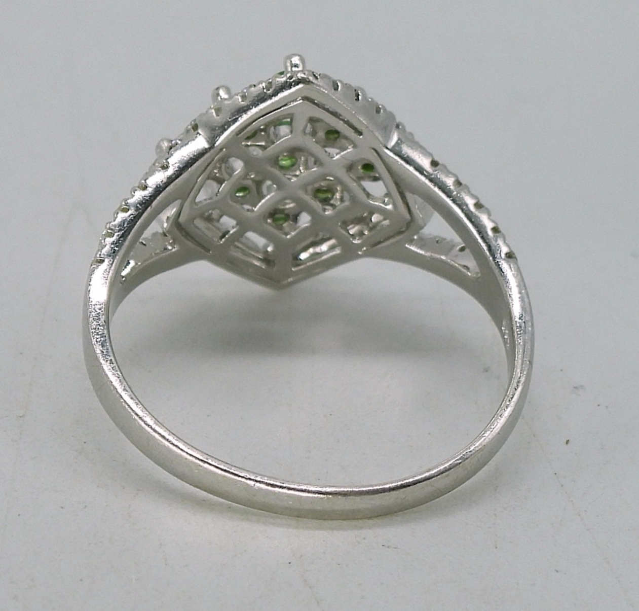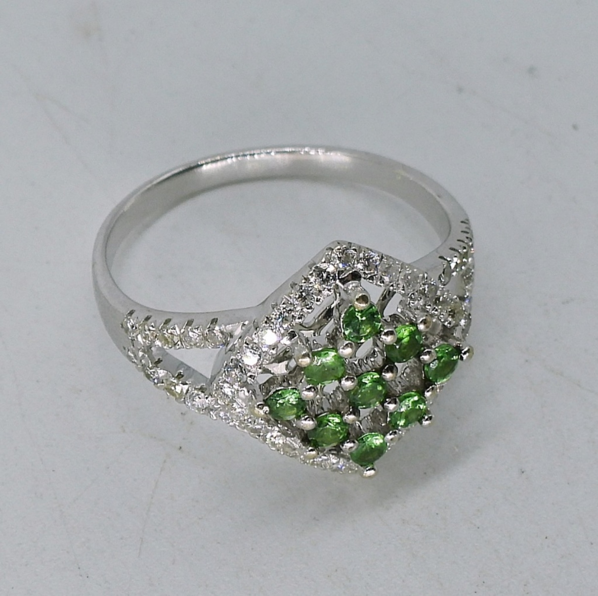 14k White Gold Ring. White stones test as diamond and moissanite. Green Gemstones are unidentified (not diamonds). Size 7.5 Marked “585”