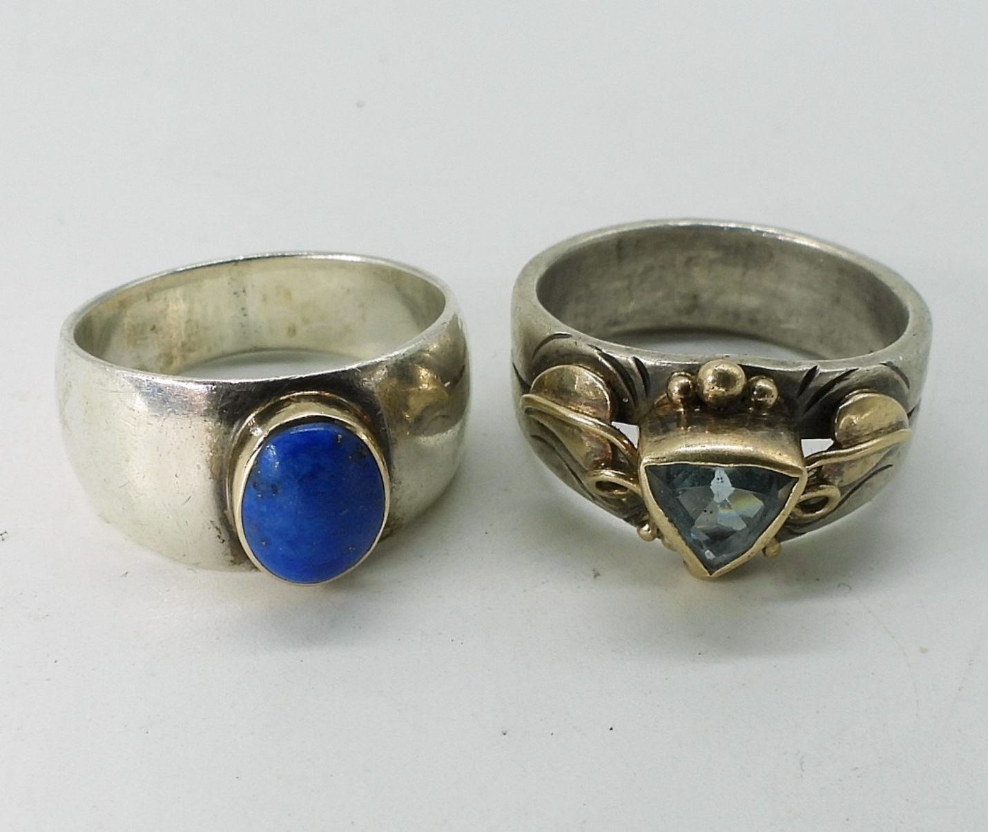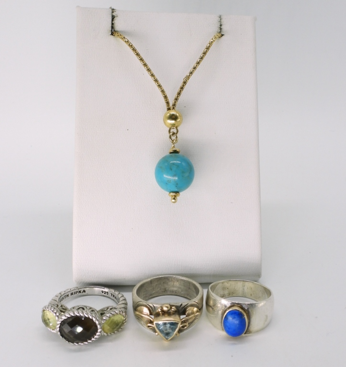 Sterling Judith Ripka ring with Smokey Quartz & Peridot. Size 6. Two sterling / 14k yellow gold rings. Stones are Lapis Lazuli & Blue Topaz. 14k is in accents. Sizes 6 & 7. Gold tone sterling necklace with turquoise