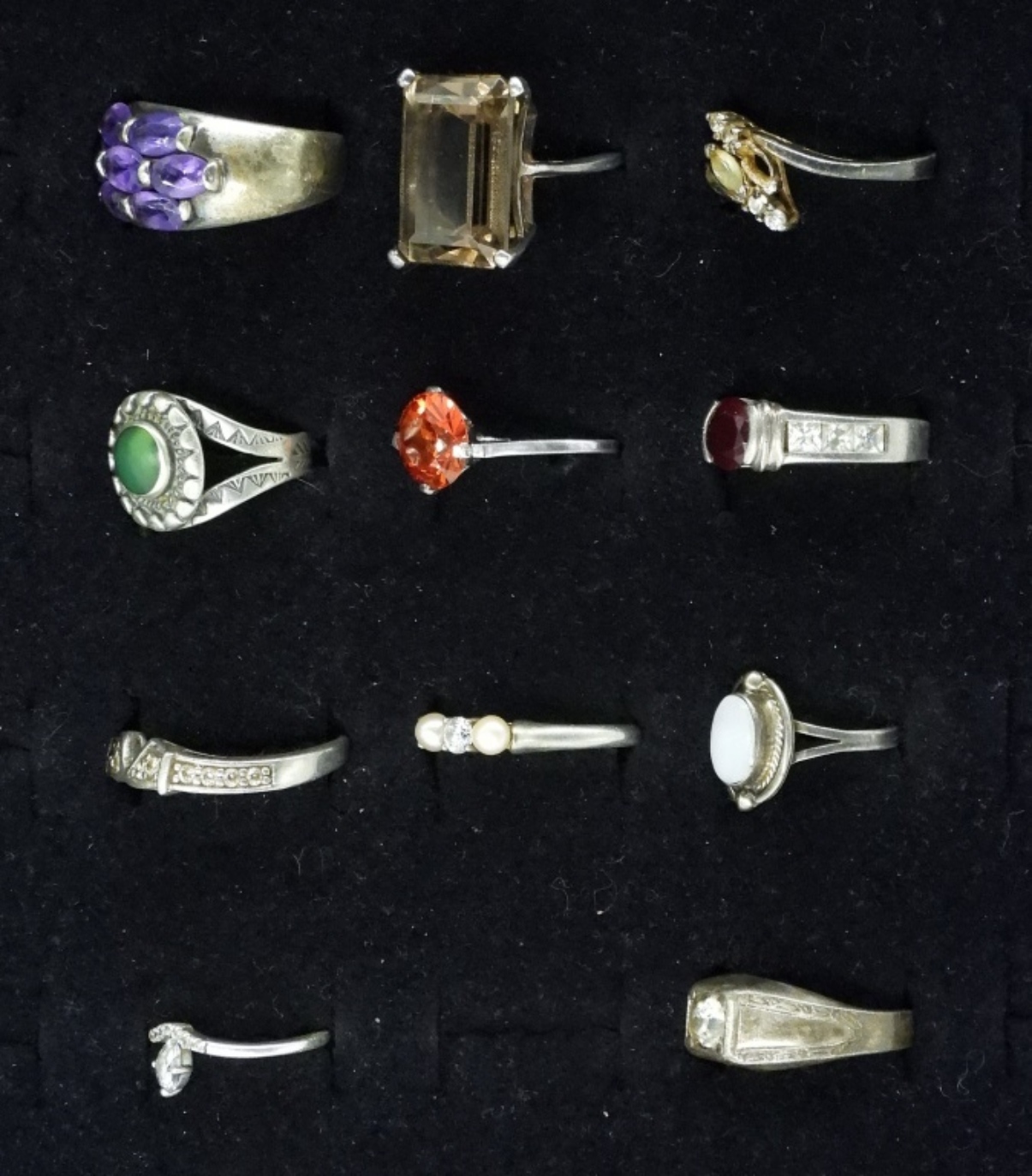 11 Sterling Rings. Pearl, Amethyst, Smokey Quartz, Garnet, Simulated Diamonds. Sizes 3-10 (24.2 dwt)