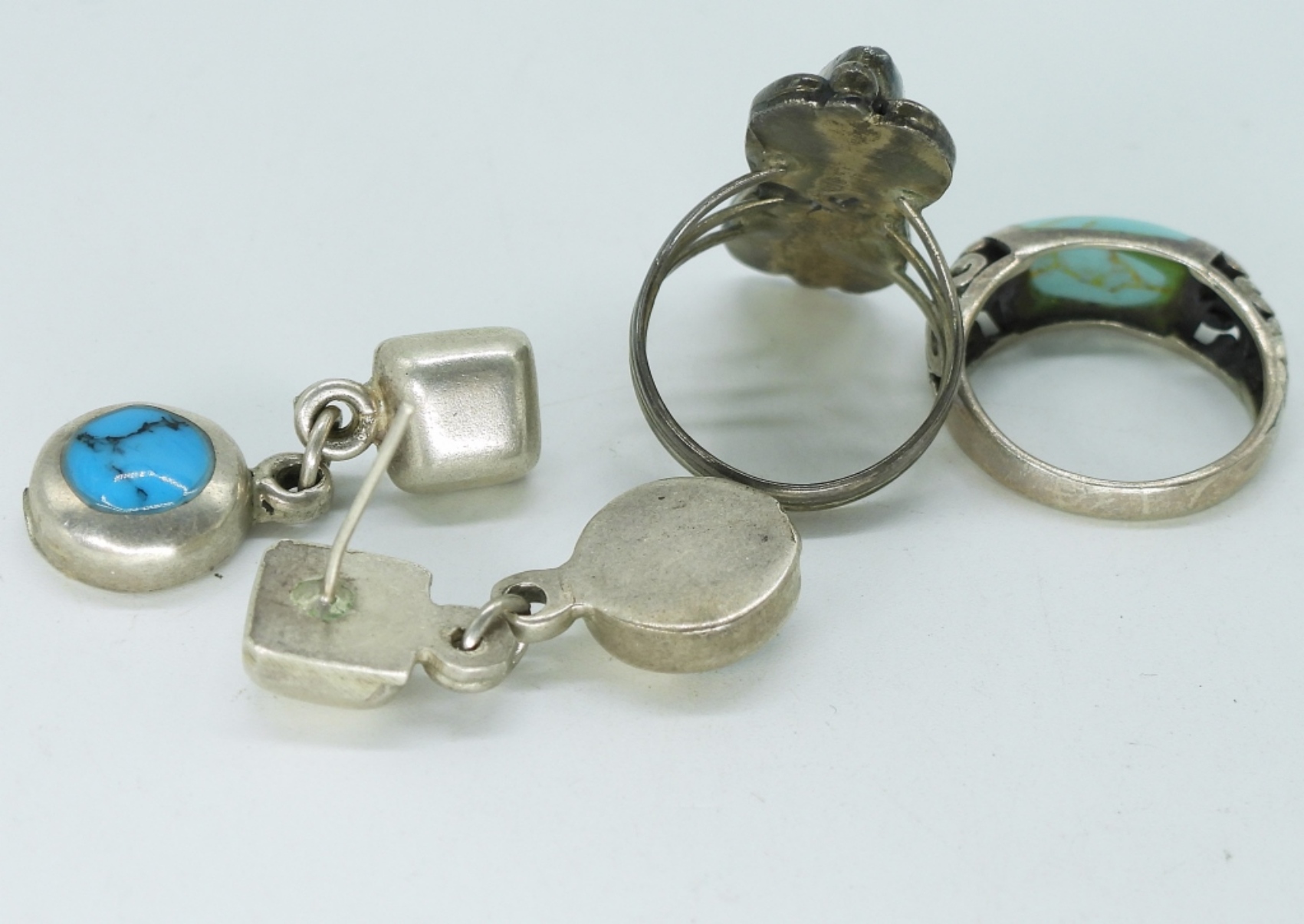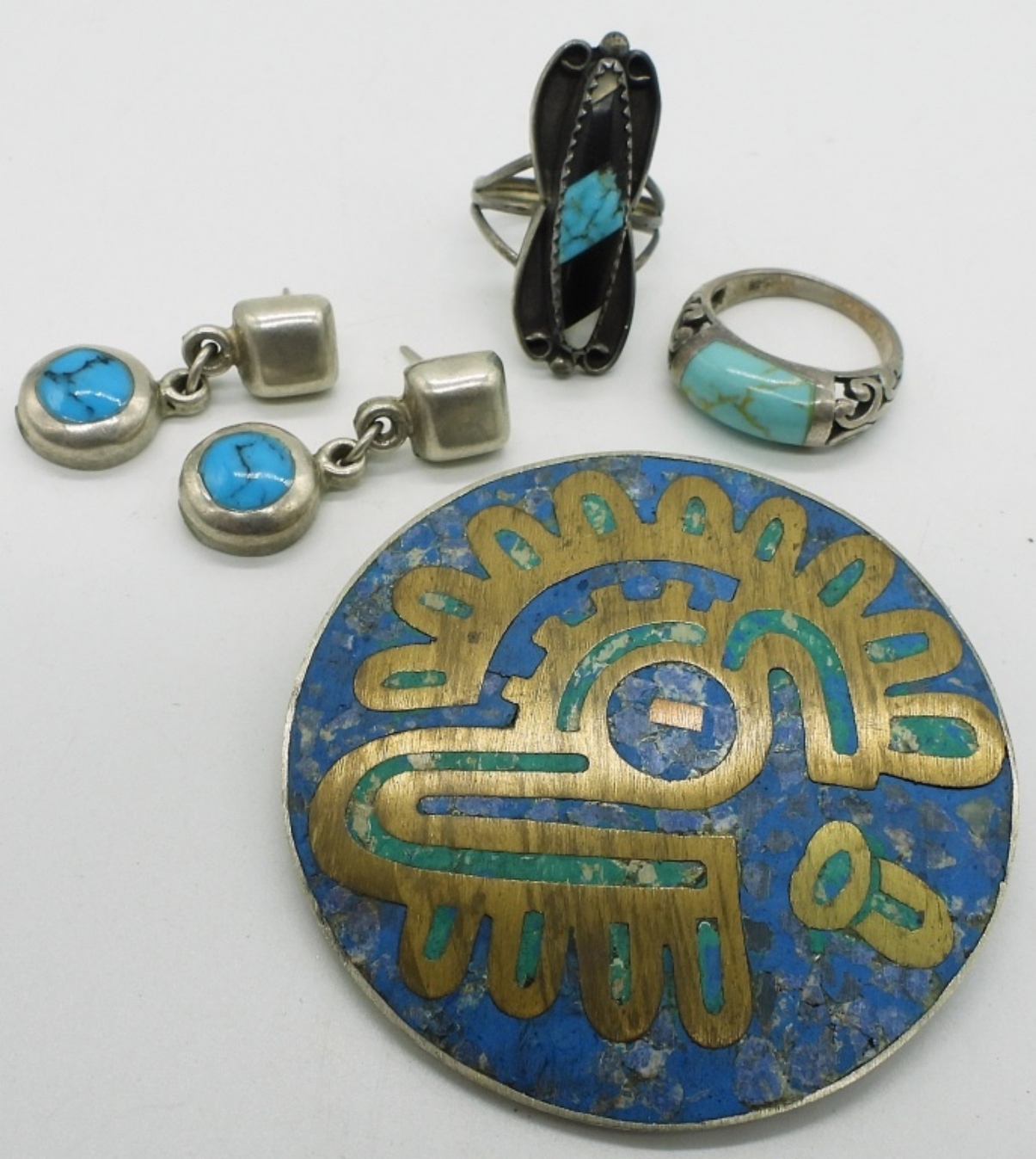 Turquoise inlay sterling pin with gold tone Mayan scene, 2″. Ring sizes 6.5 & 6. Turquoise pierced earrings, 1″. (22.7 dwt)