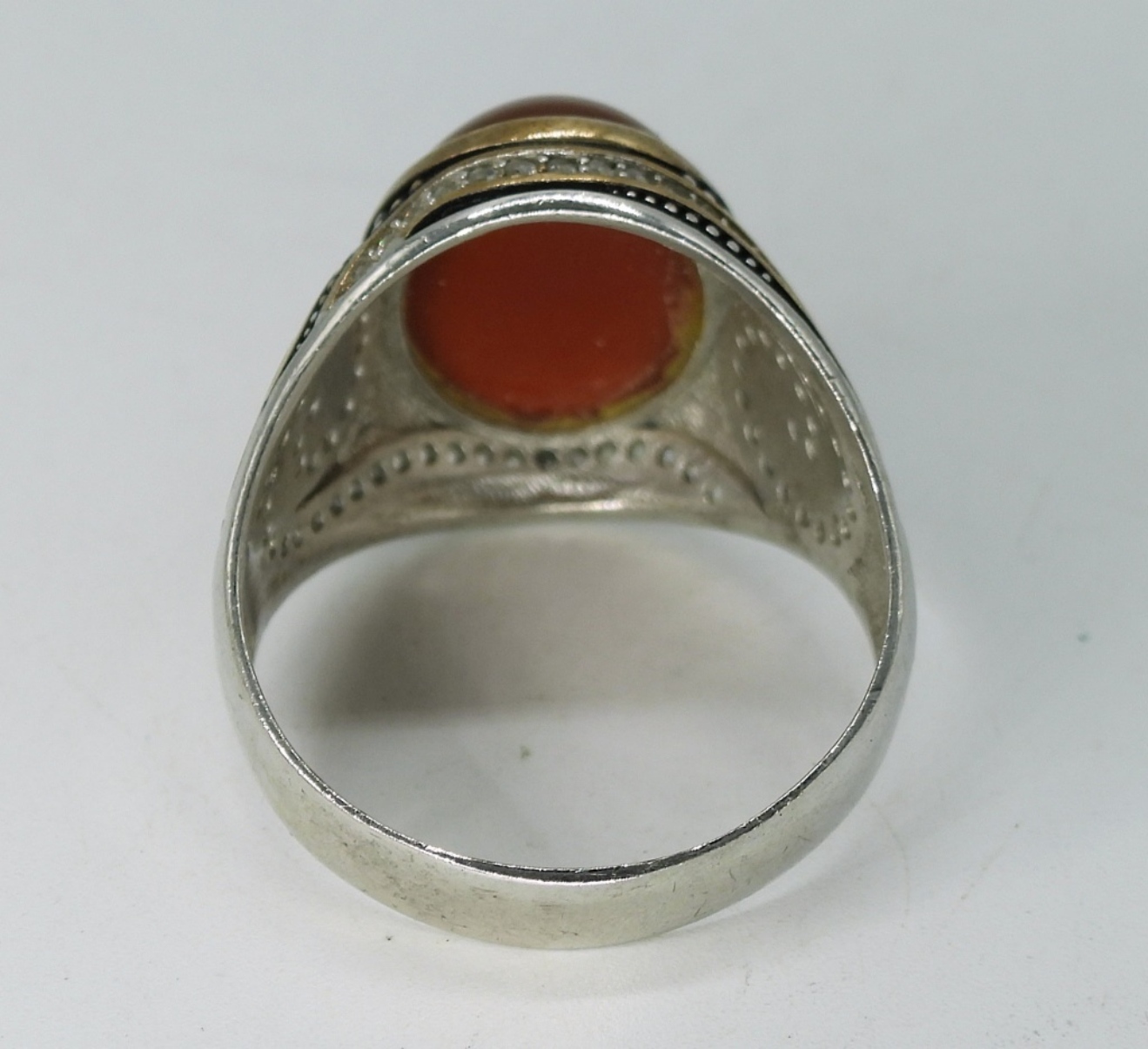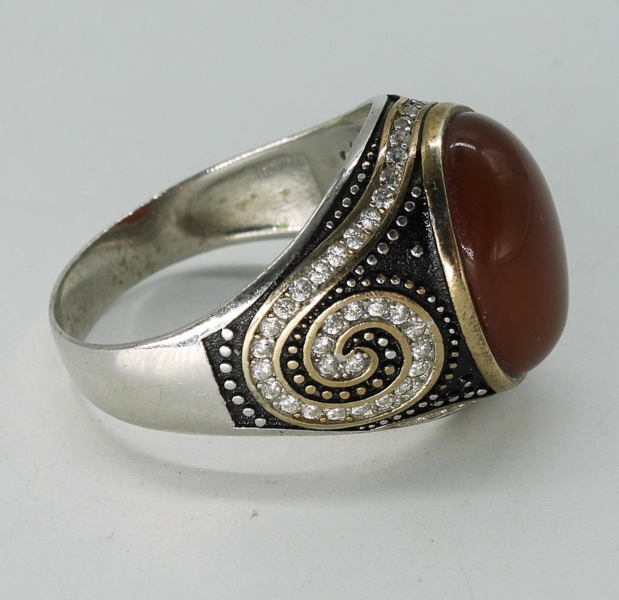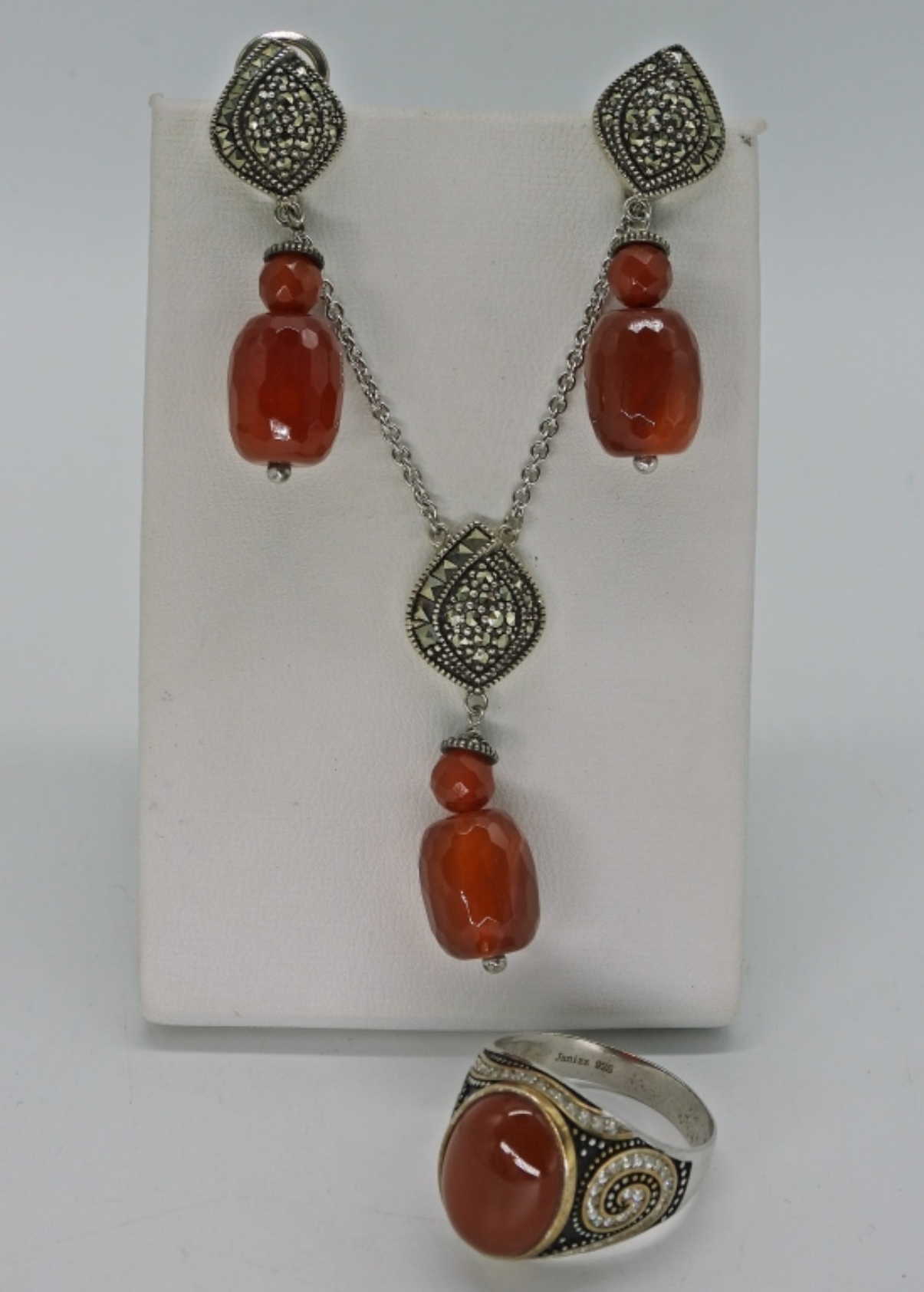 Carnelian / Moissanite Necklace & Pierced Earrings. 18″ & 2″. Sterling ring with carnelian gemstone and simulated diamonds, size 12. (20 dwt)