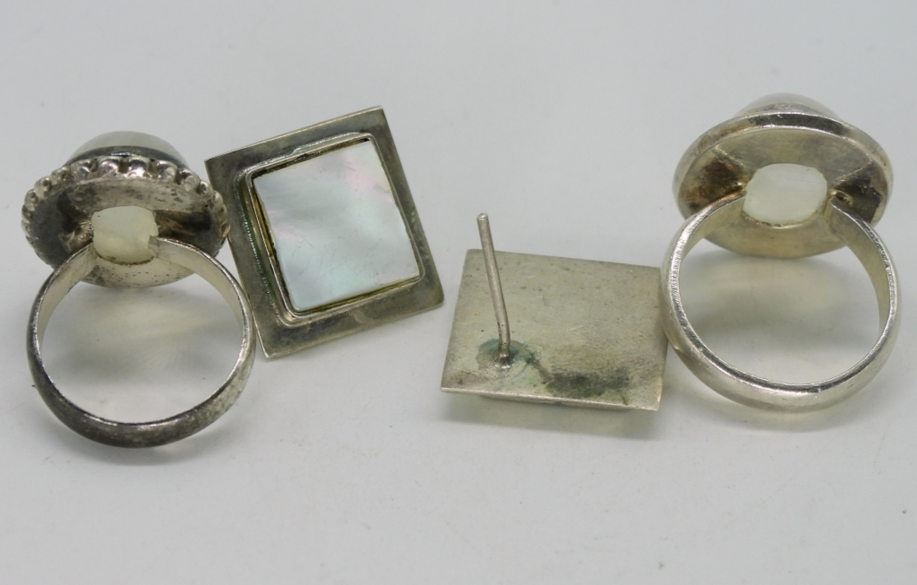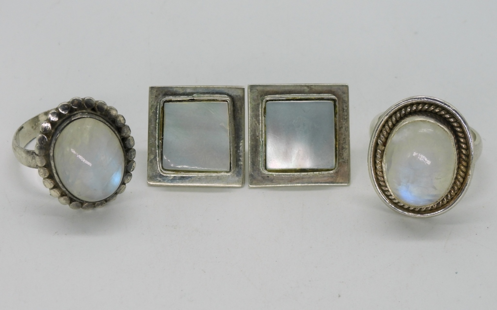 Two sterling rings with large moonstone gemstones, sizes 6 & 7. Pierced sterling mother of pearl earrings. (14 dwt)