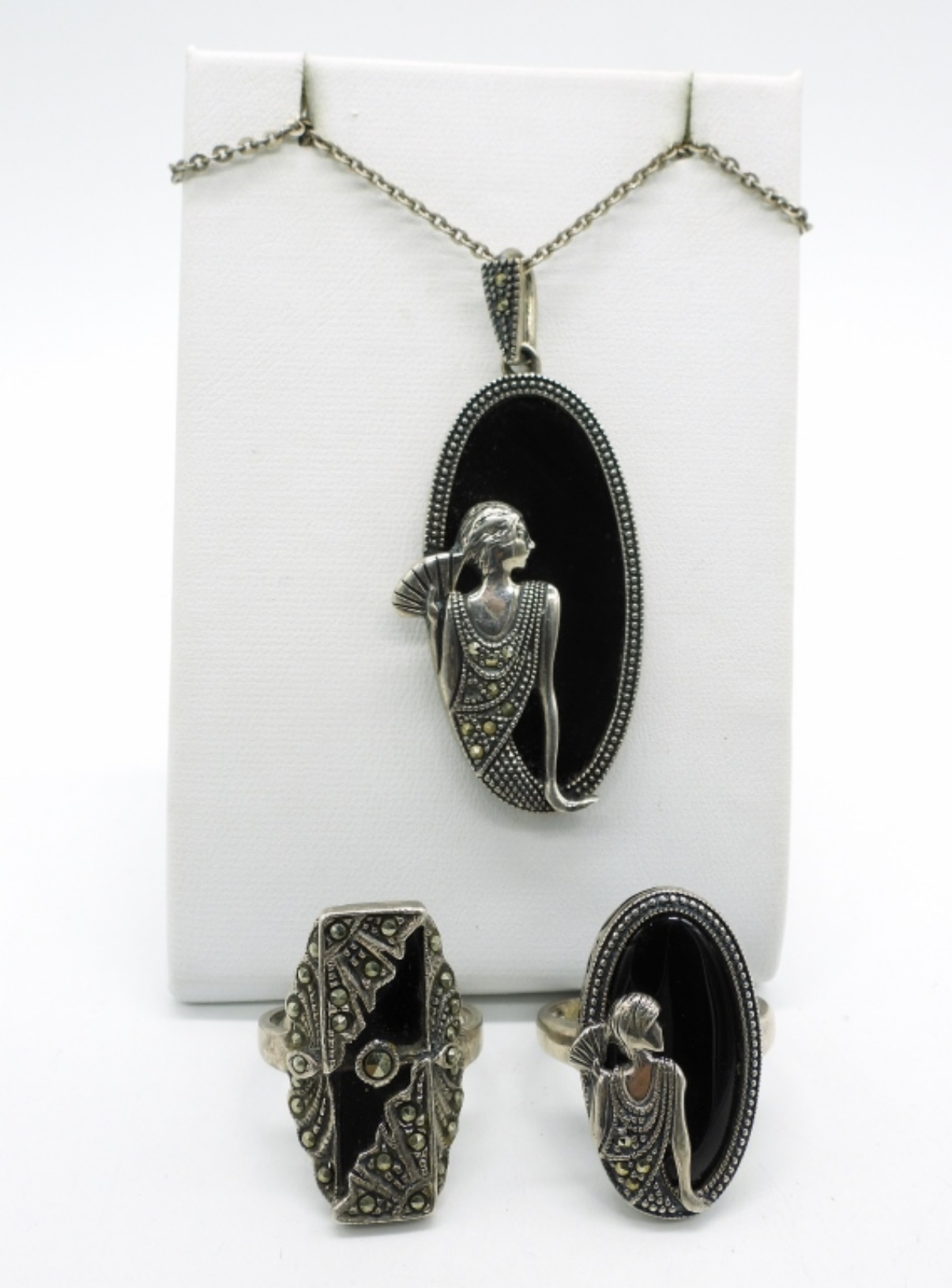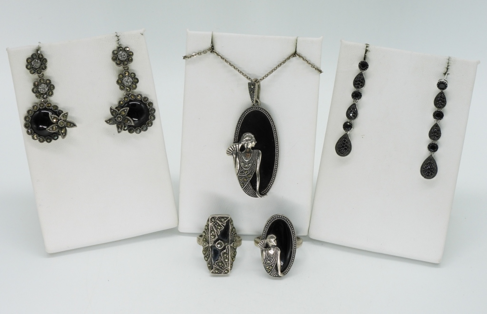 Sterling Art Deco & Black Onyx. Necklace is 16″. Two rings, sizes 6 & 8. Two pair pierced earrings, 1.5″. (20.6 dwt)