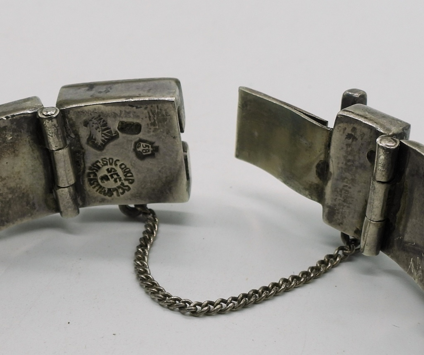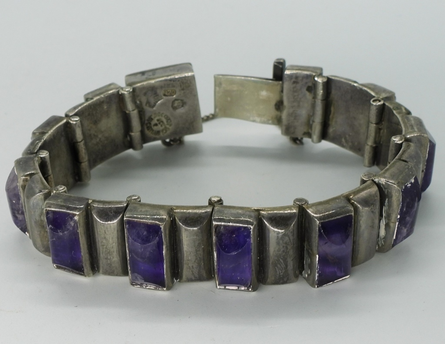 Heavy sterling bracelet, with amethyst gemstones. 8″. Some of the gemstones are scuffed up. Clasp works. (53 dwt)