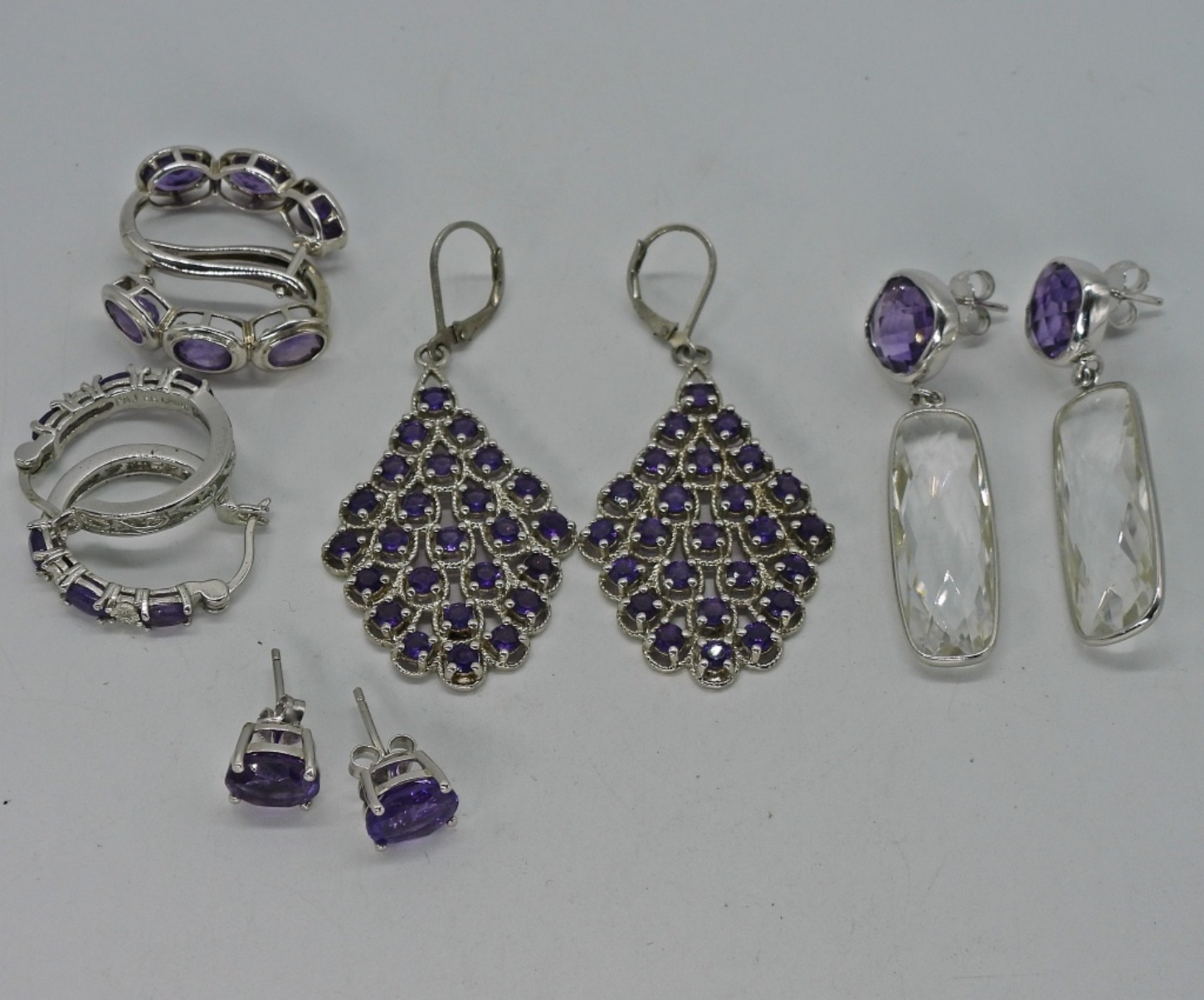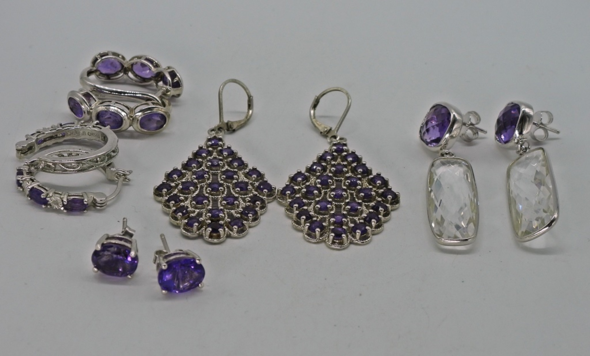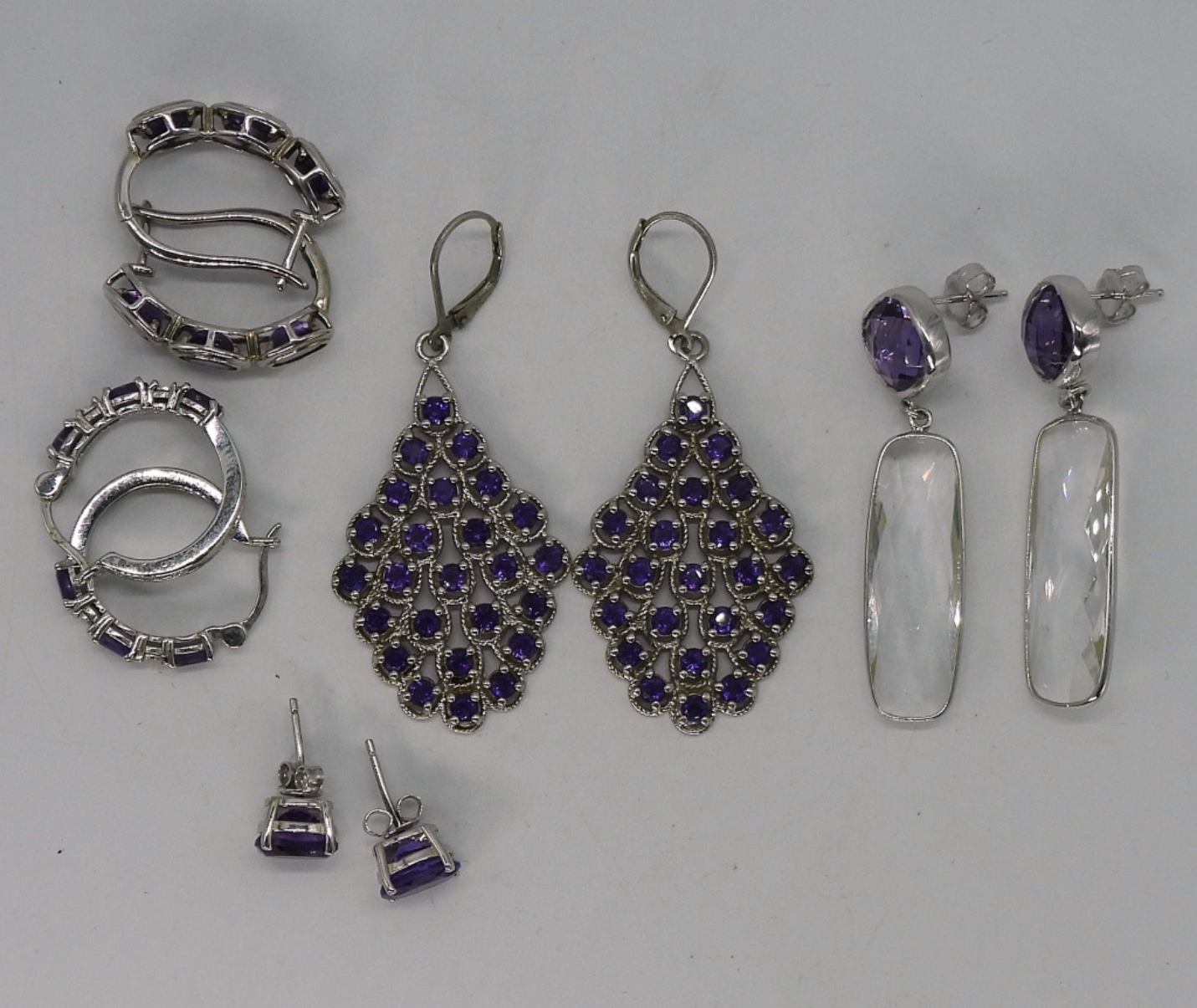 Five pair of sterling pierced earrings with Amethyst gemstones. 1-2″. (22 dwt)