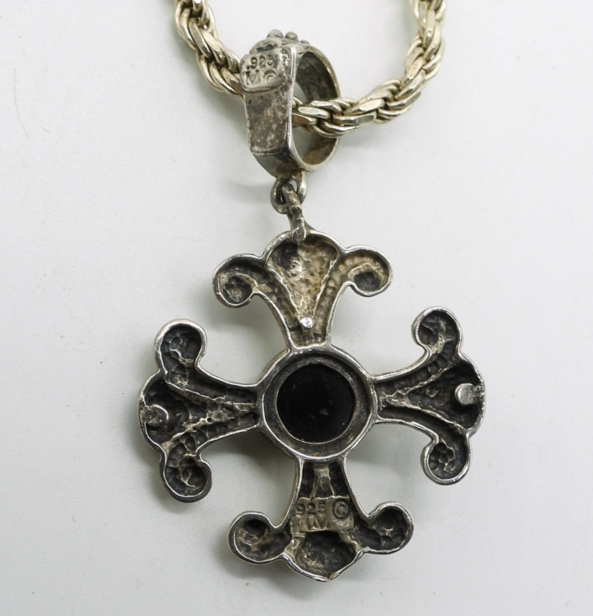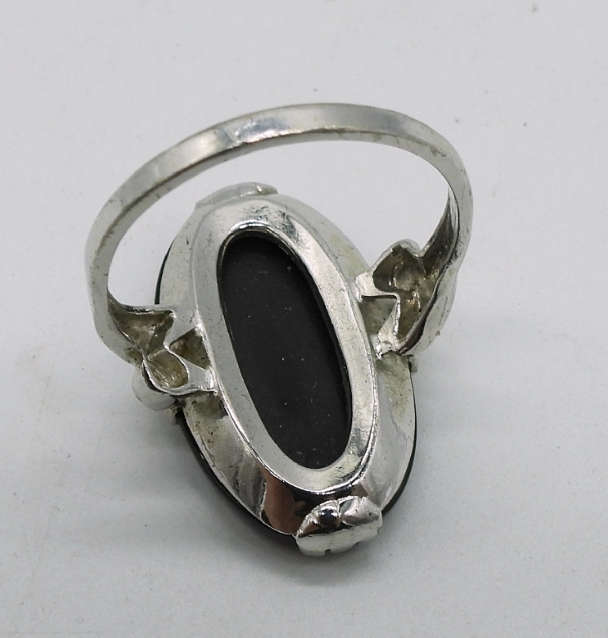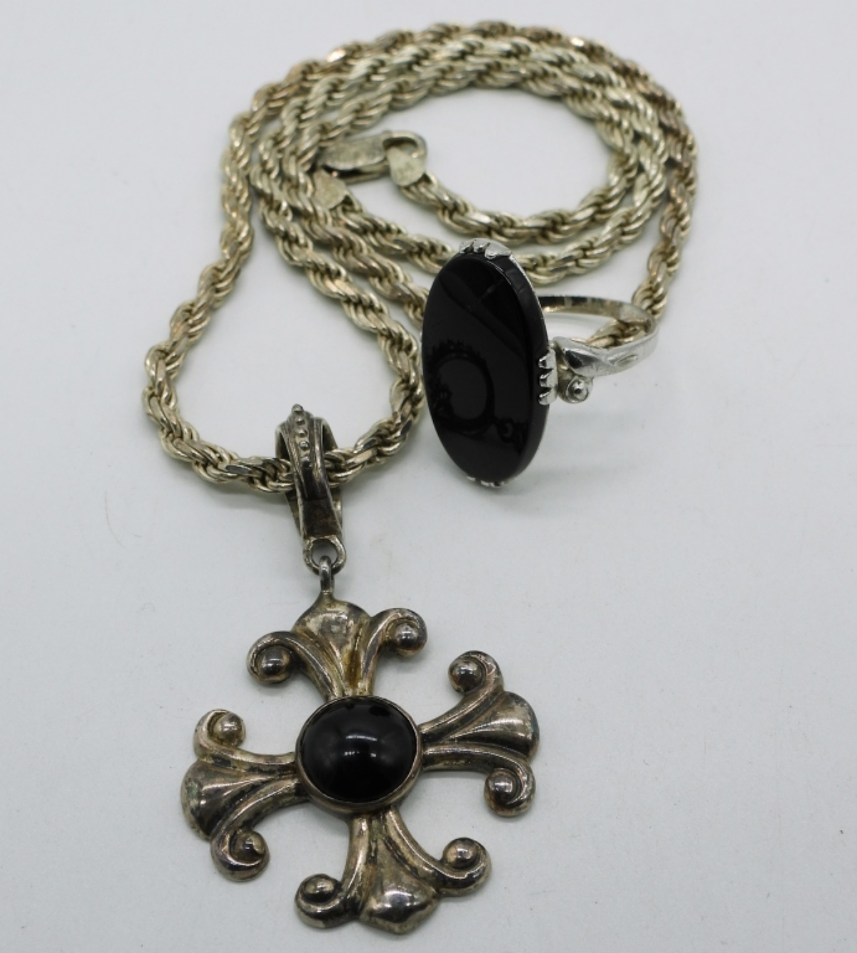 Sterling pendant with black onyx on a 20″ sterling chain. Ring is size 9.5 (24.2 dwt)
