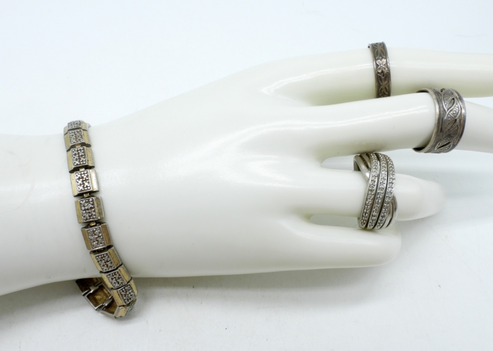 Vintage sterling & gold tone bracelet., 7″ and three rings. Sizes 7 & 8. (15.2 DWT)