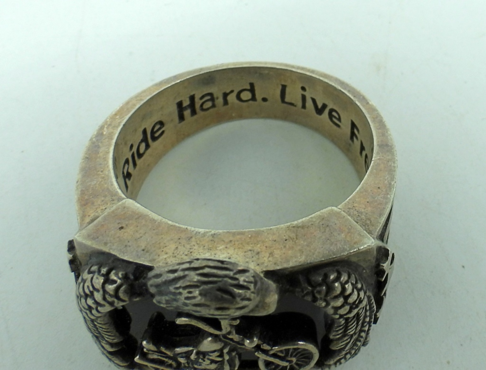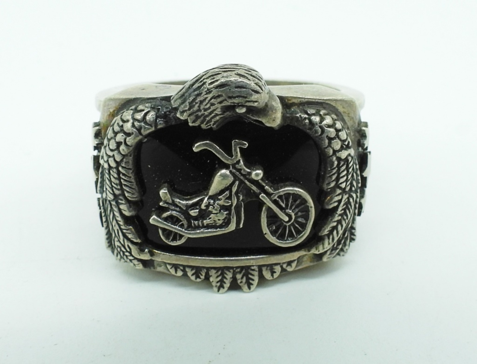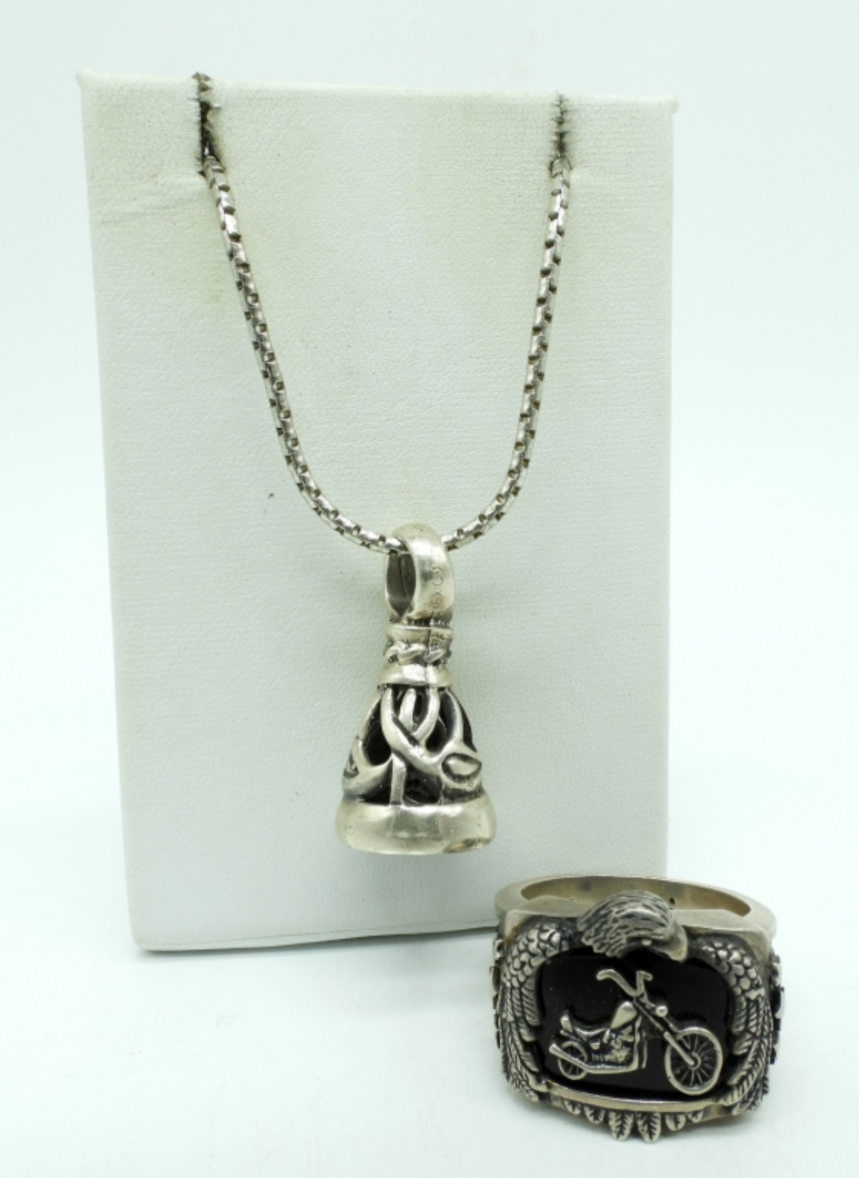 Sterling Motorcycle Eagle Black Onyx Ring, size 12. Sterling bell pendant on a 20″ chain. (26 dwt)