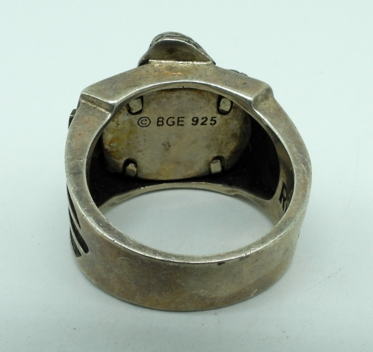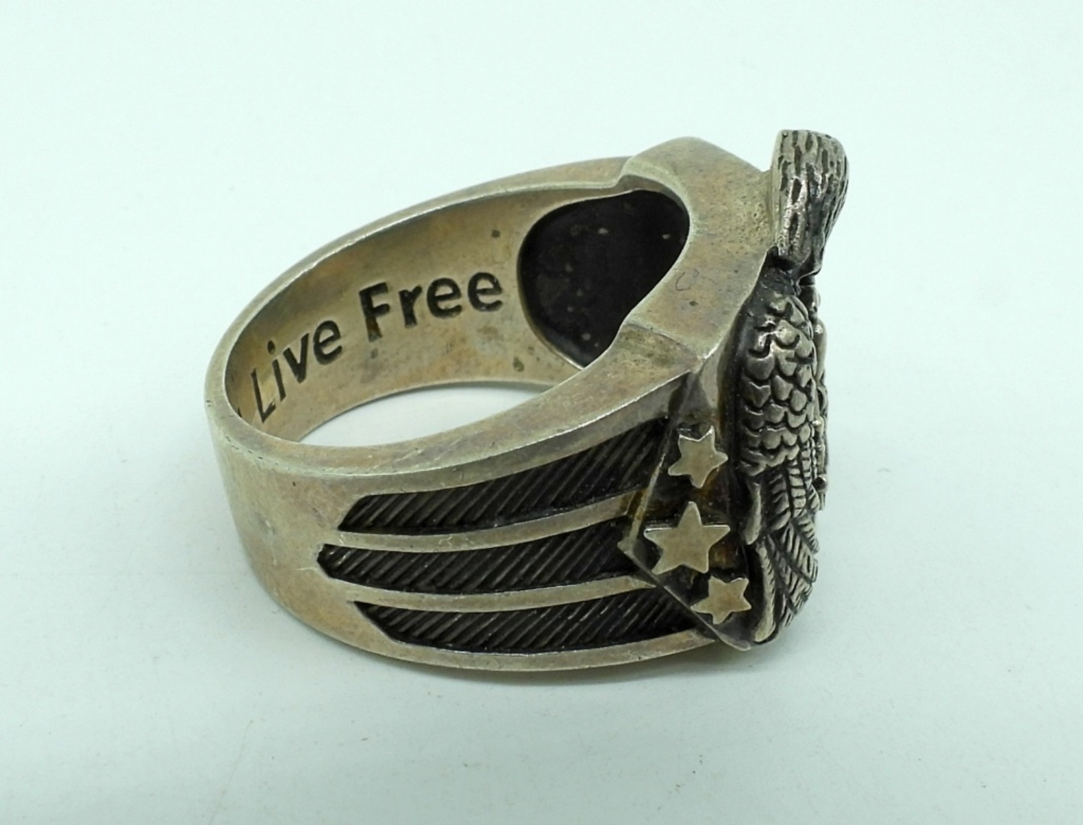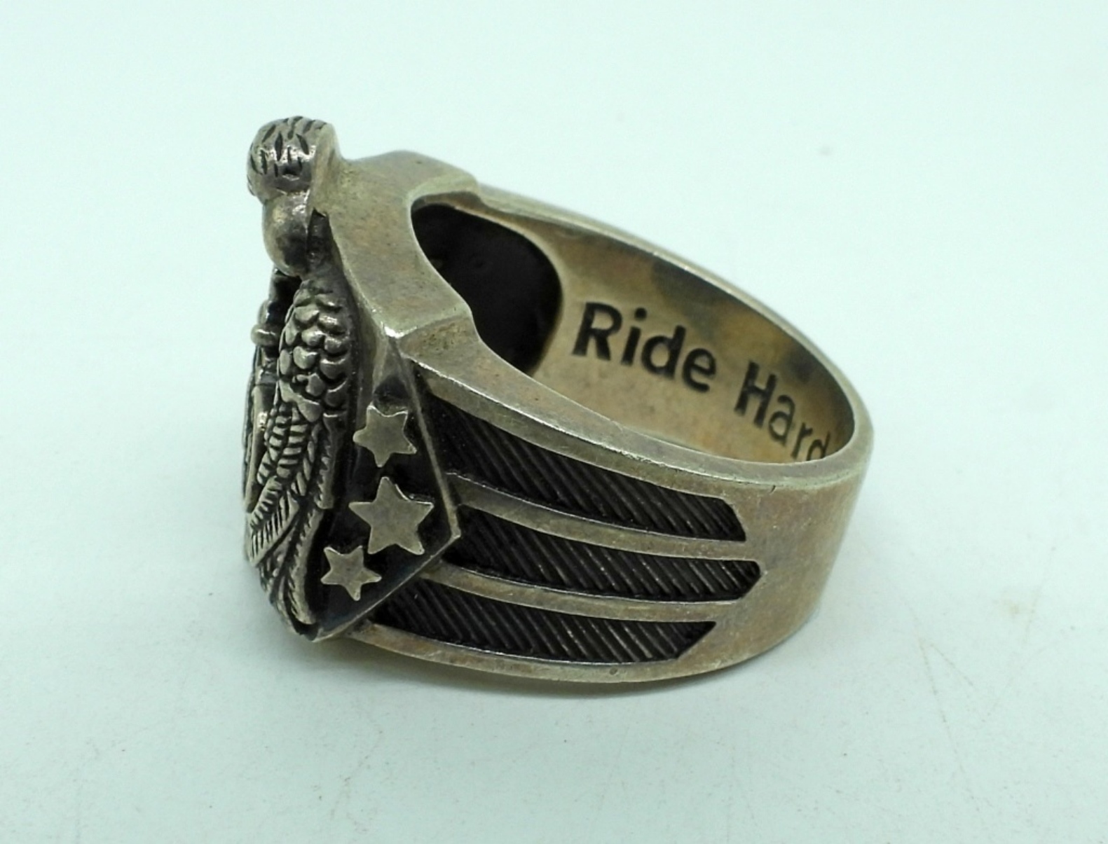 Sterling Motorcycle Eagle Black Onyx Ring, size 12. Sterling bell pendant on a 20″ chain. (26 dwt)